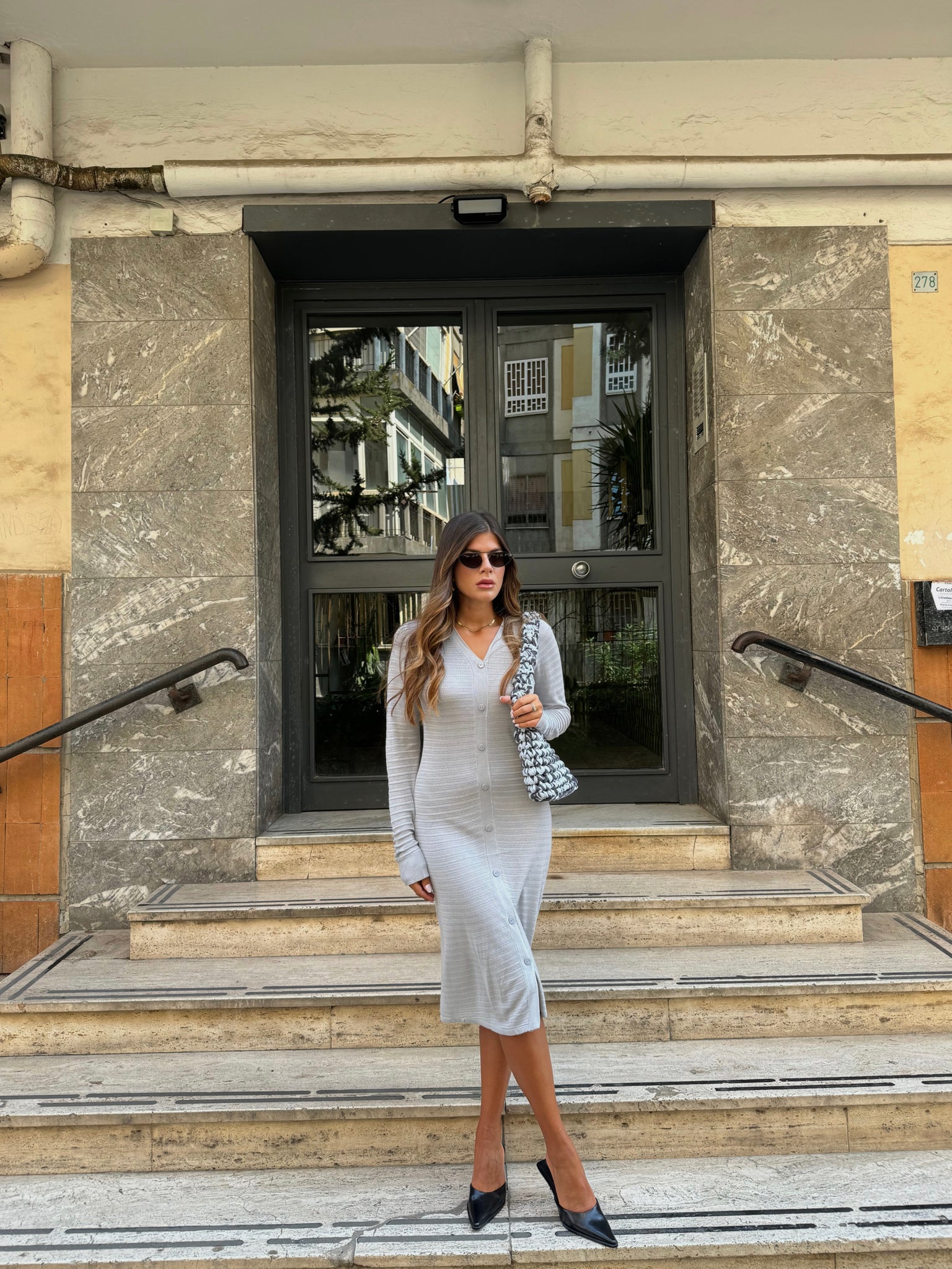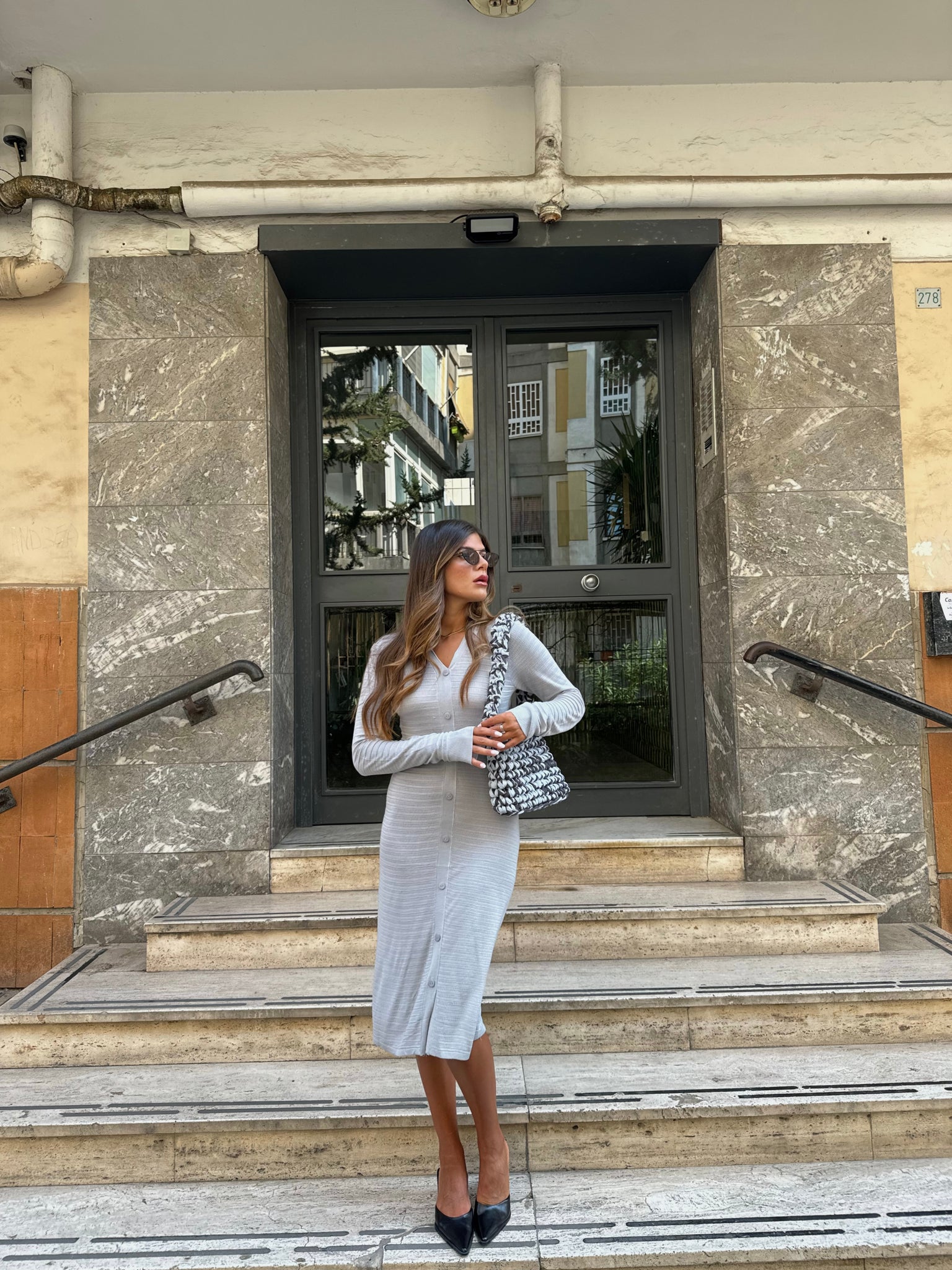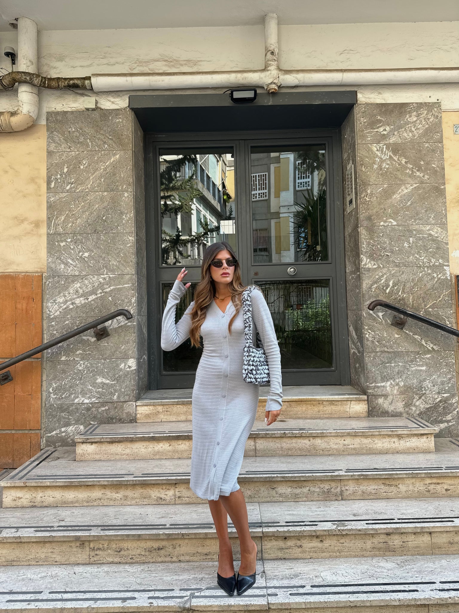 Abito in maglia traforato con finti bottoni. 70% viscosa 30% poliestere. Francesca è alta 1,68cm