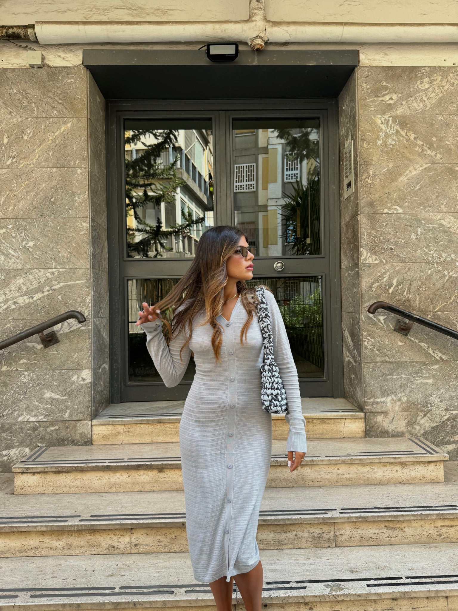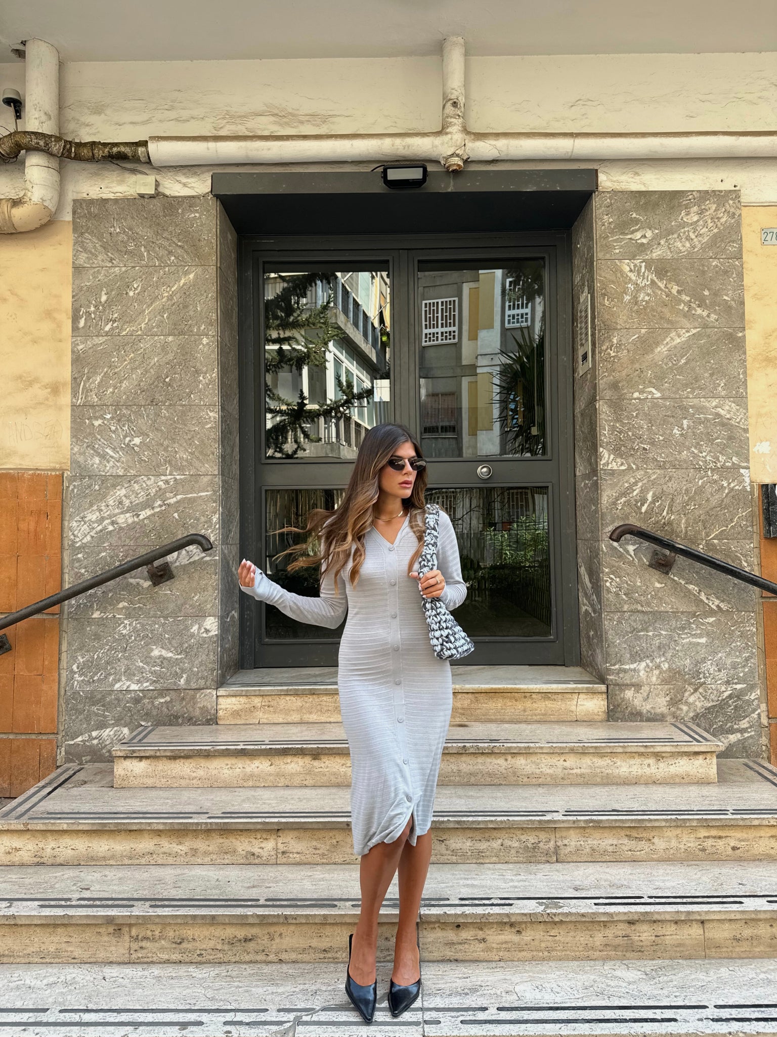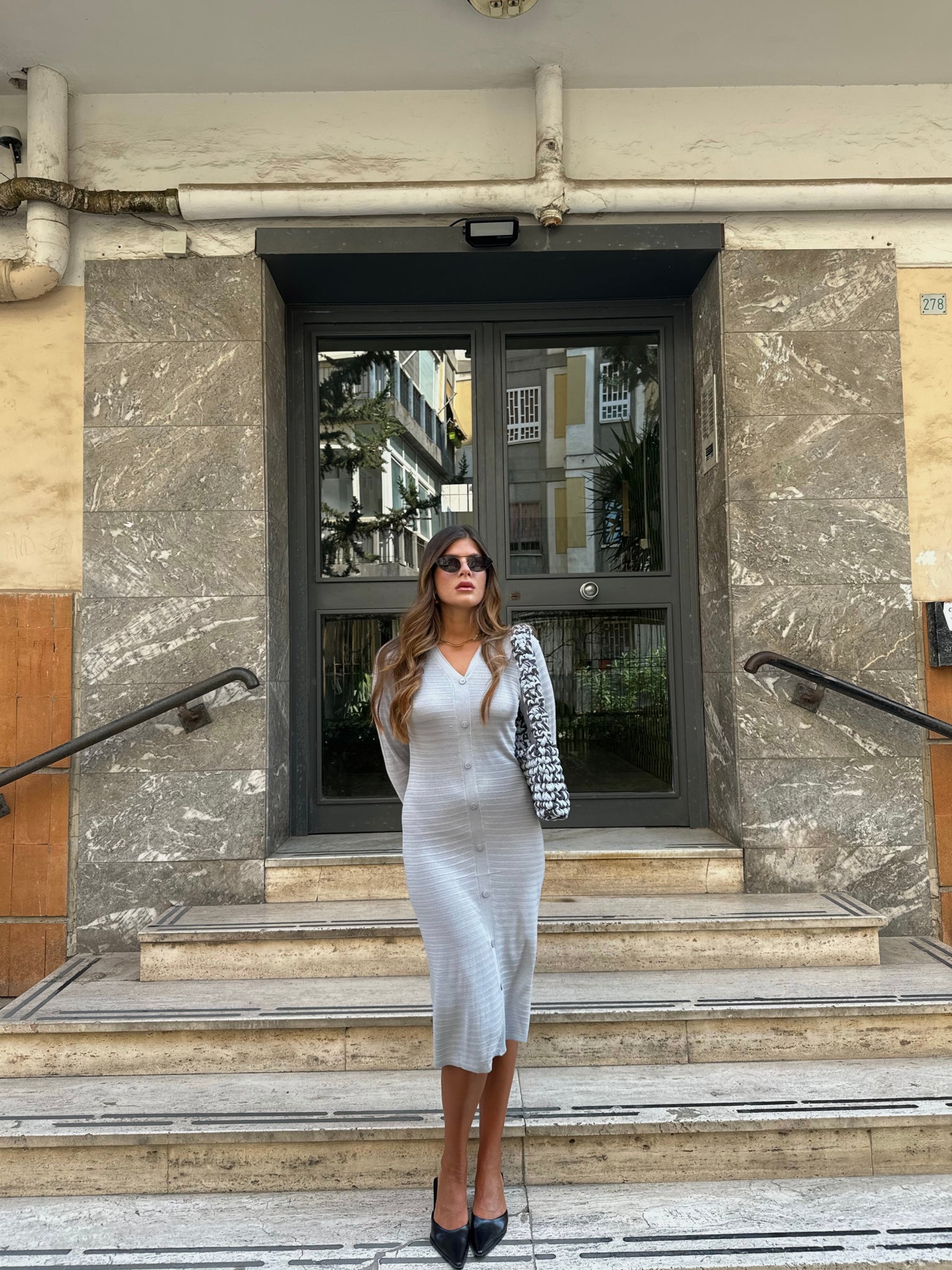 Abito in maglia traforato con finti bottoni. 70% viscosa 30% poliestere. Francesca è alta 1,68cm