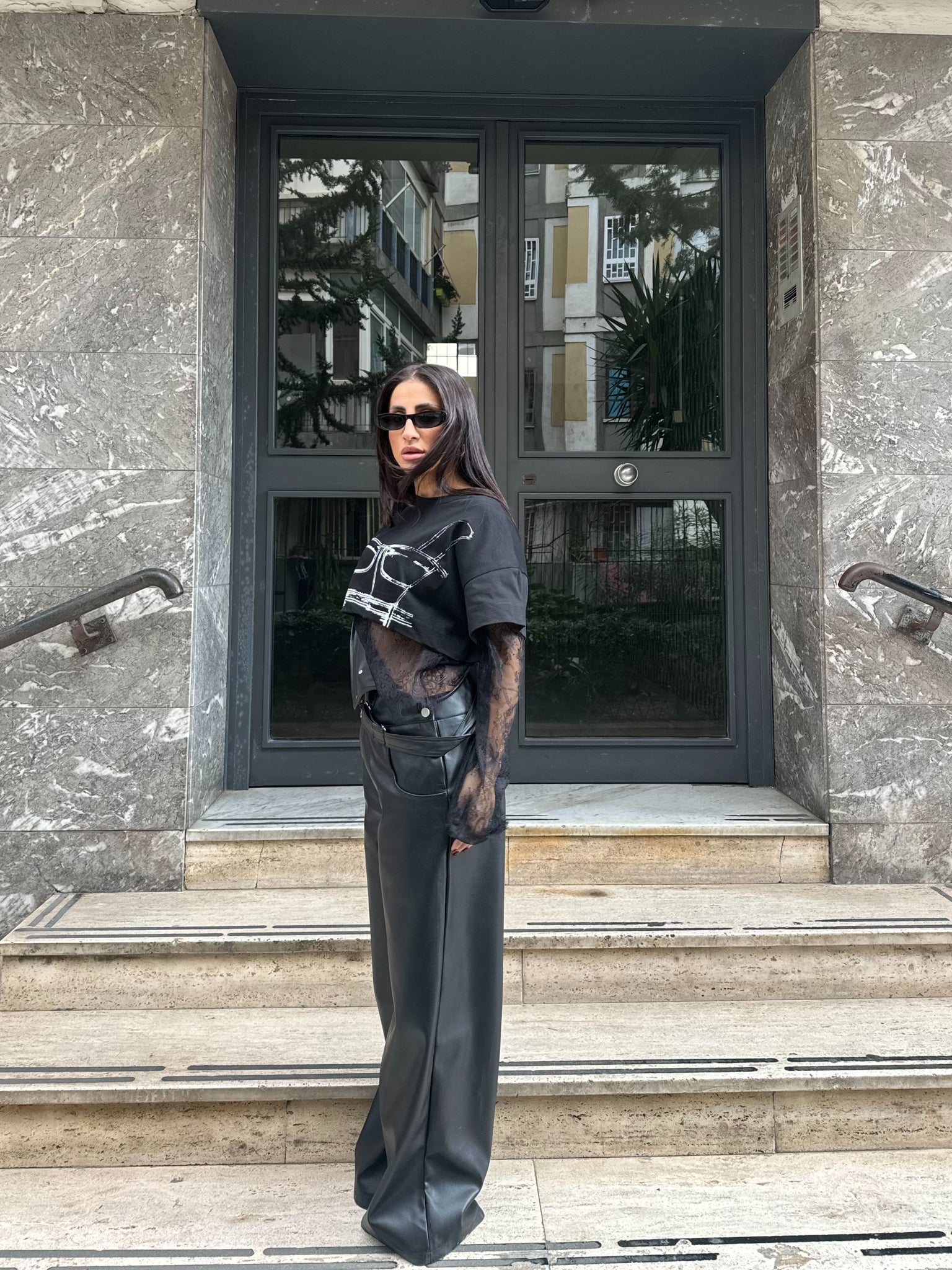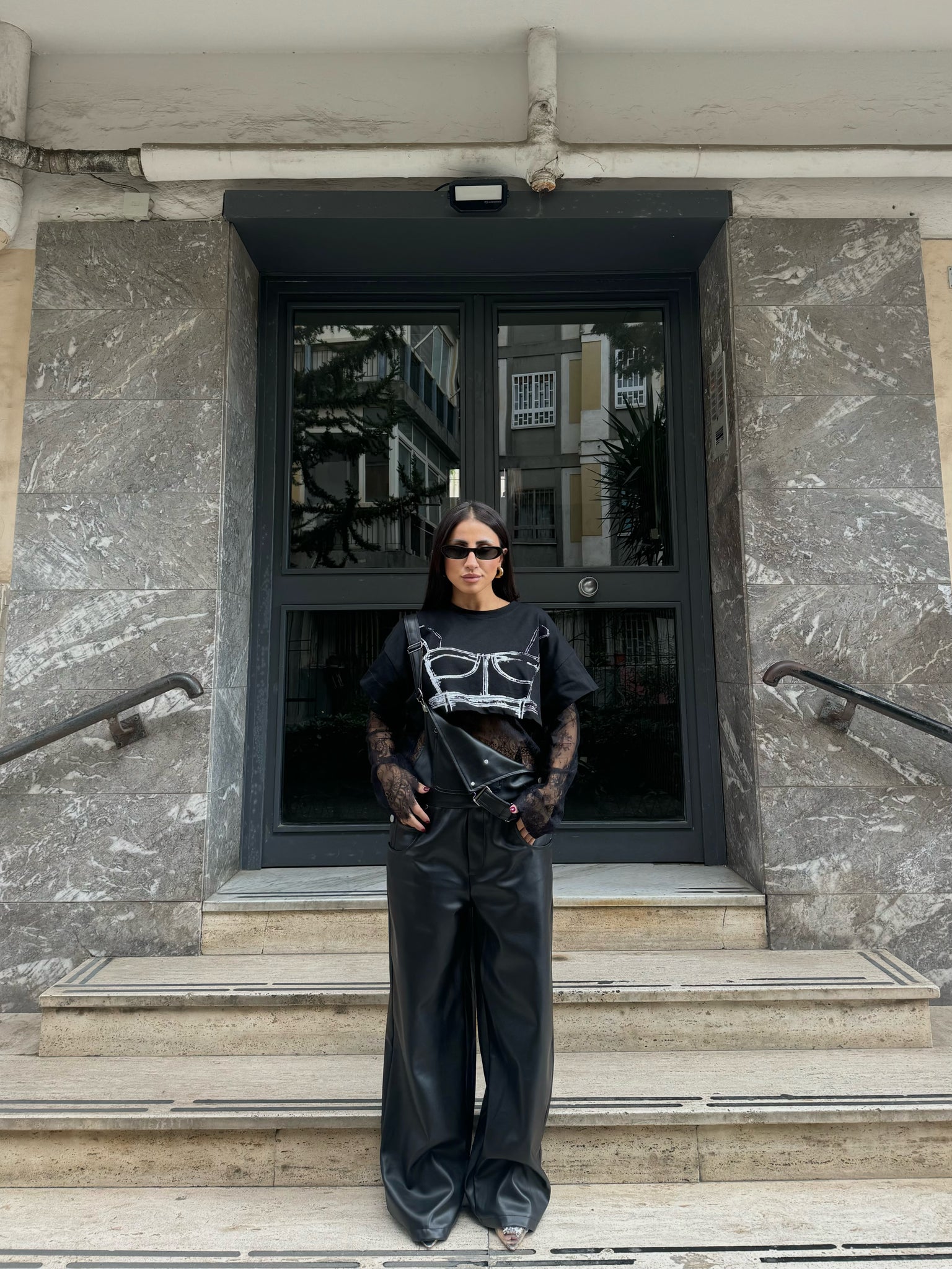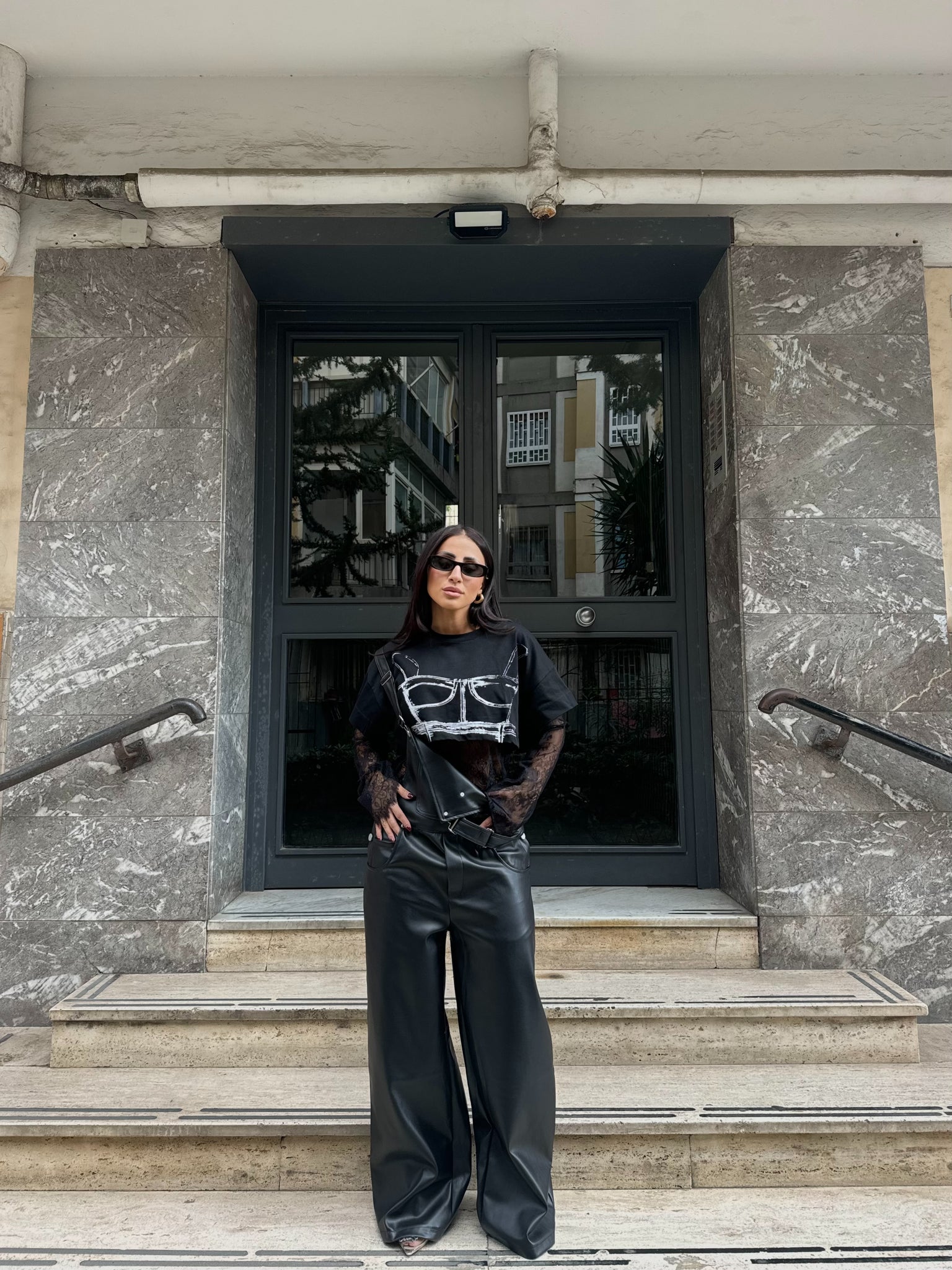 Salopette over in ecopelle. Martina è alta 1,57cm indossa tg S. 55% poliestere 45% poliuretano.
