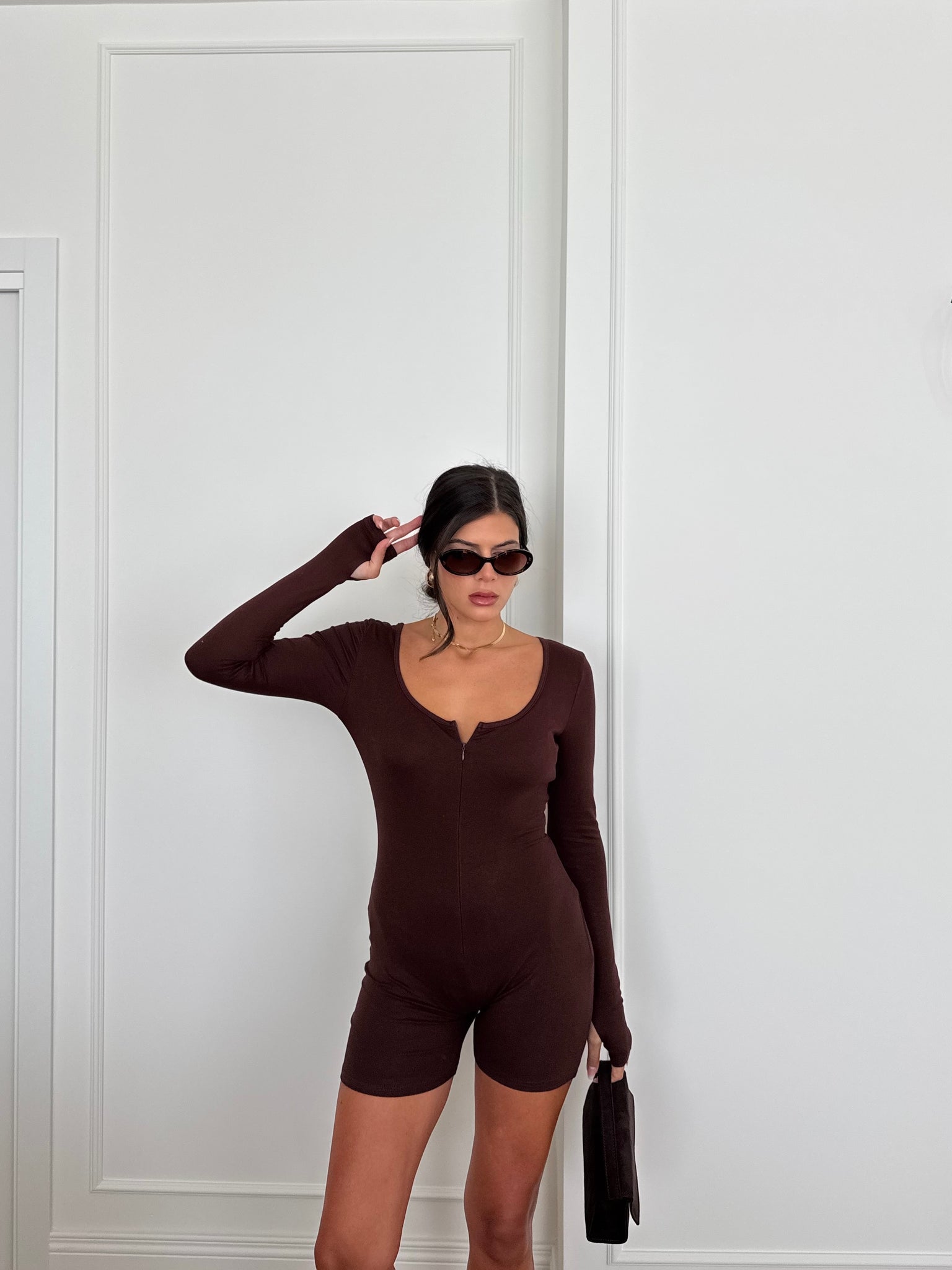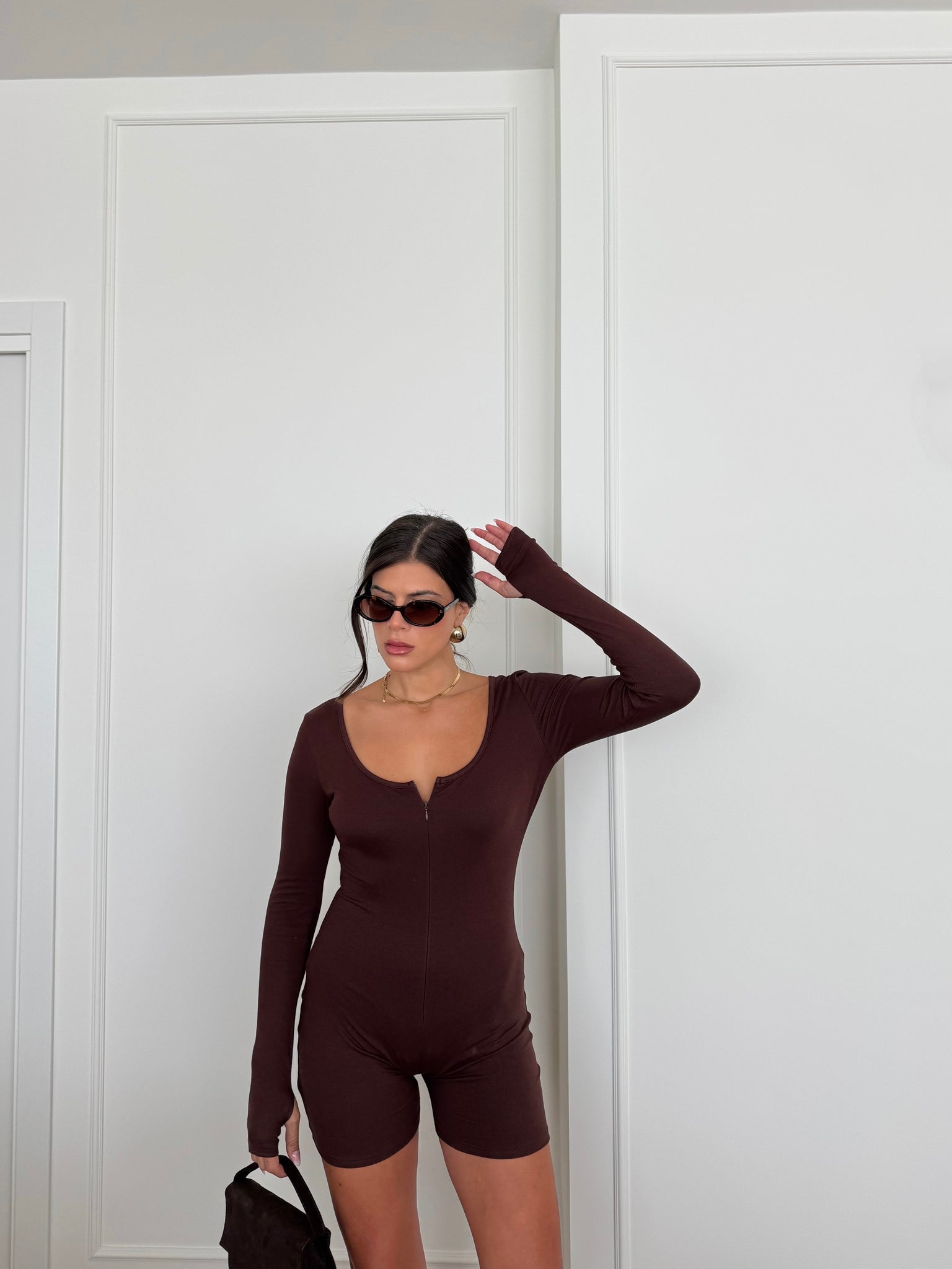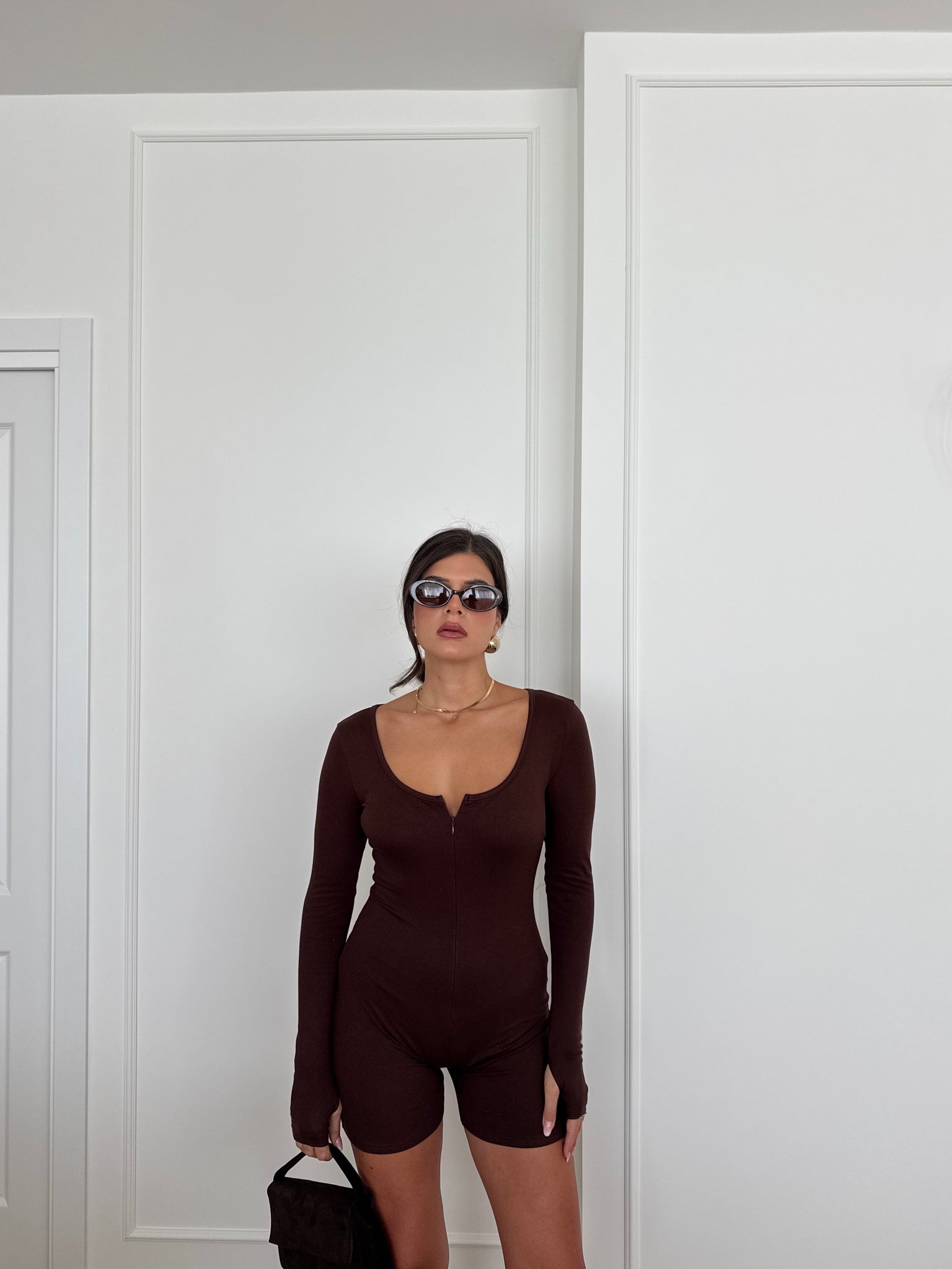Tutina corta elastica con zip anteriore. Francesca è alta 1,68cm