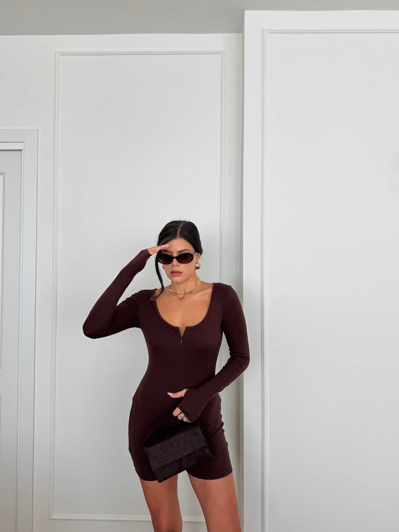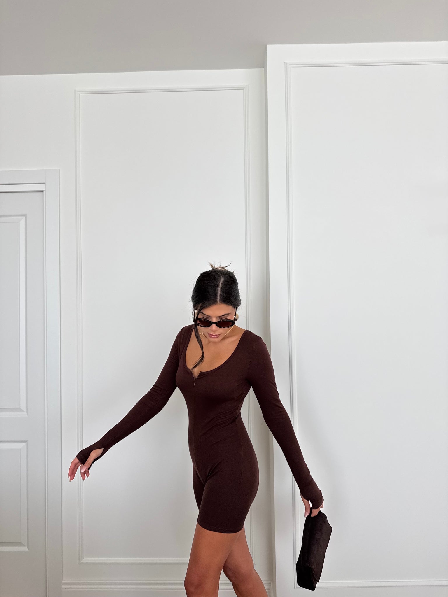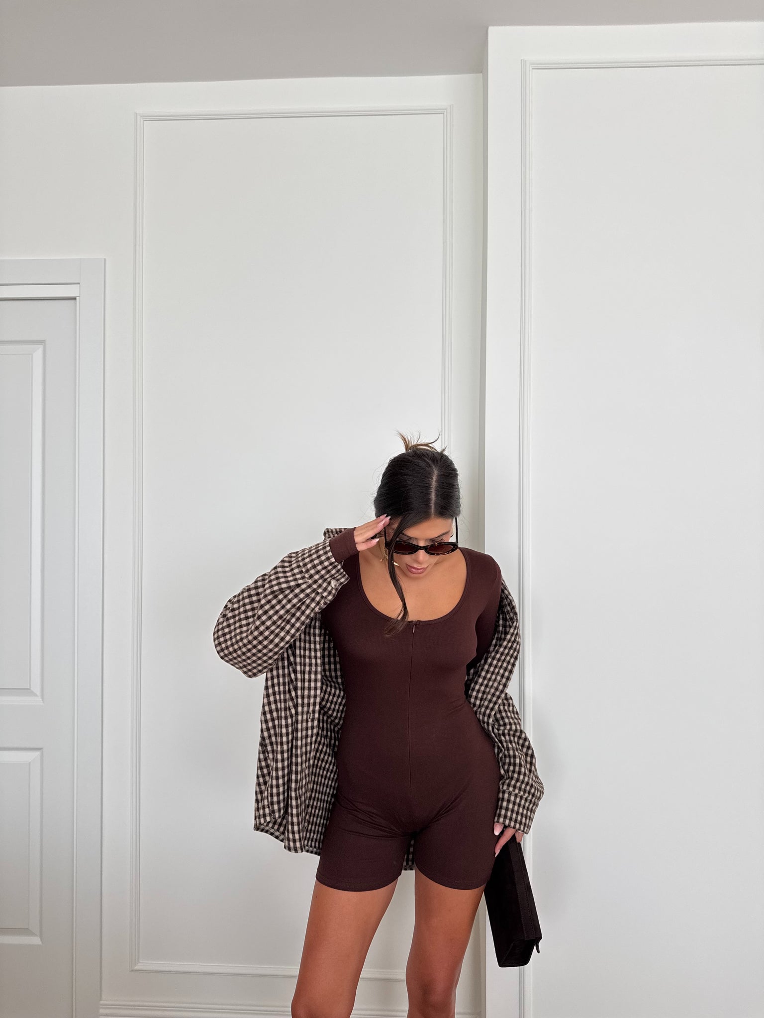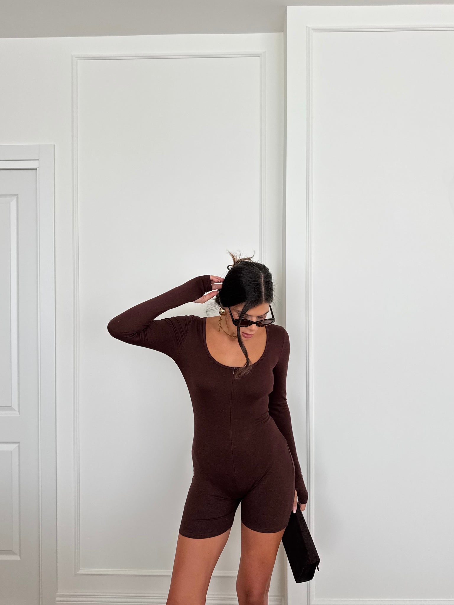 Tutina corta elastica con zip anteriore. Francesca è alta 1,68cm