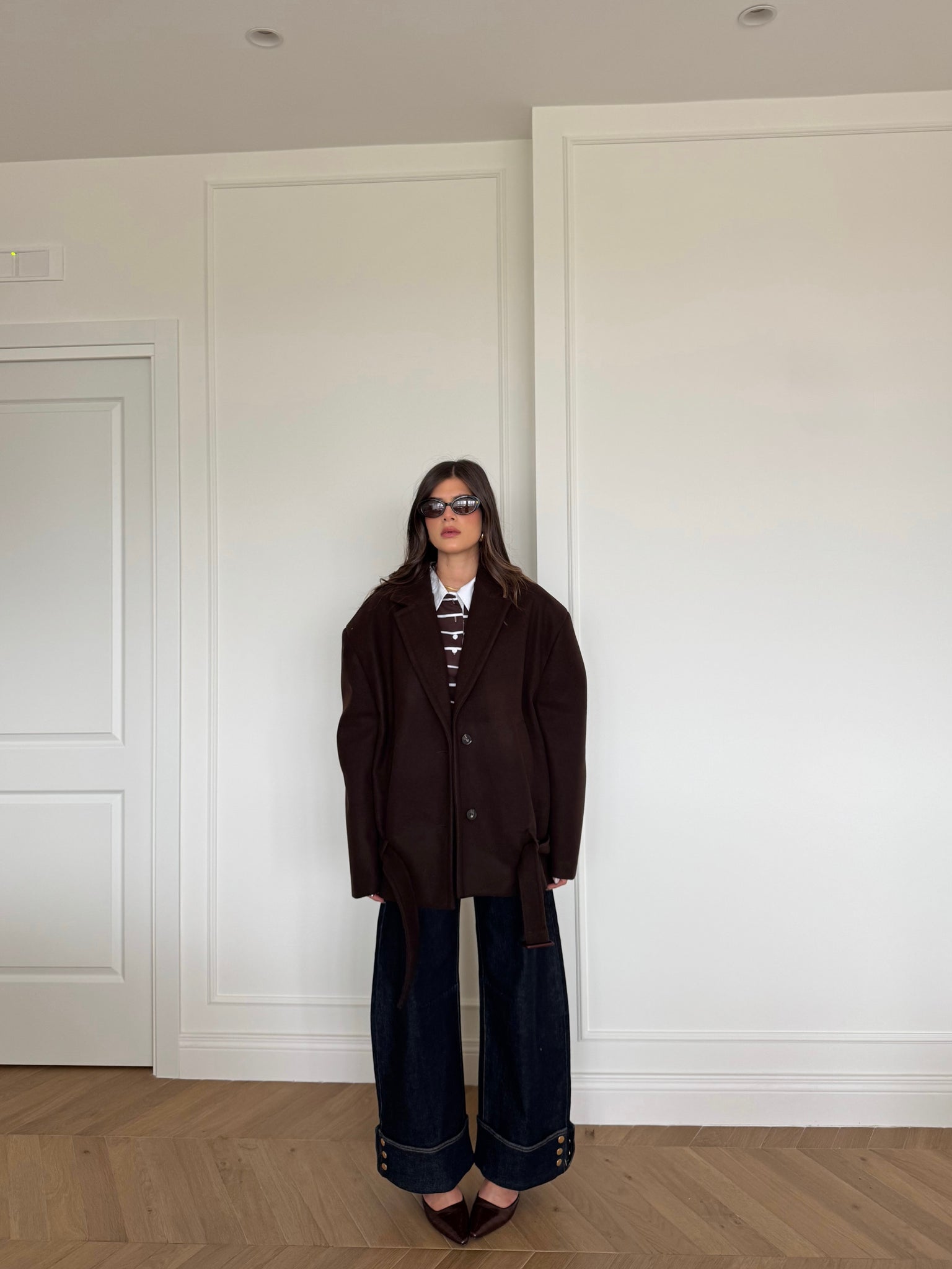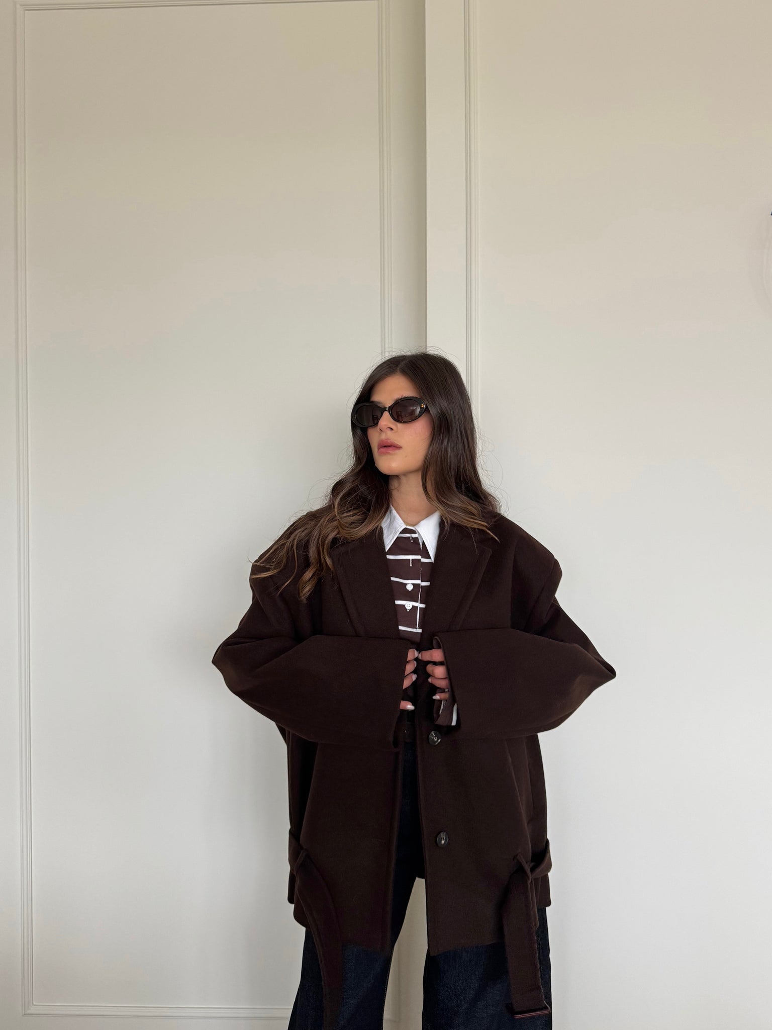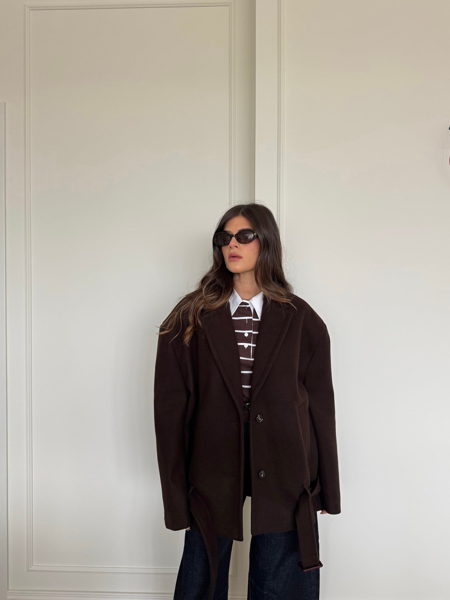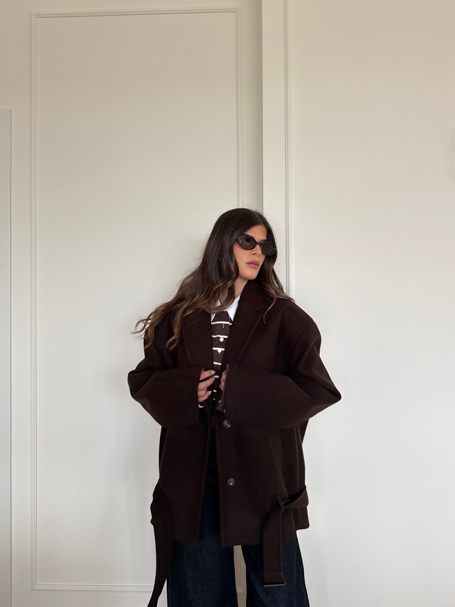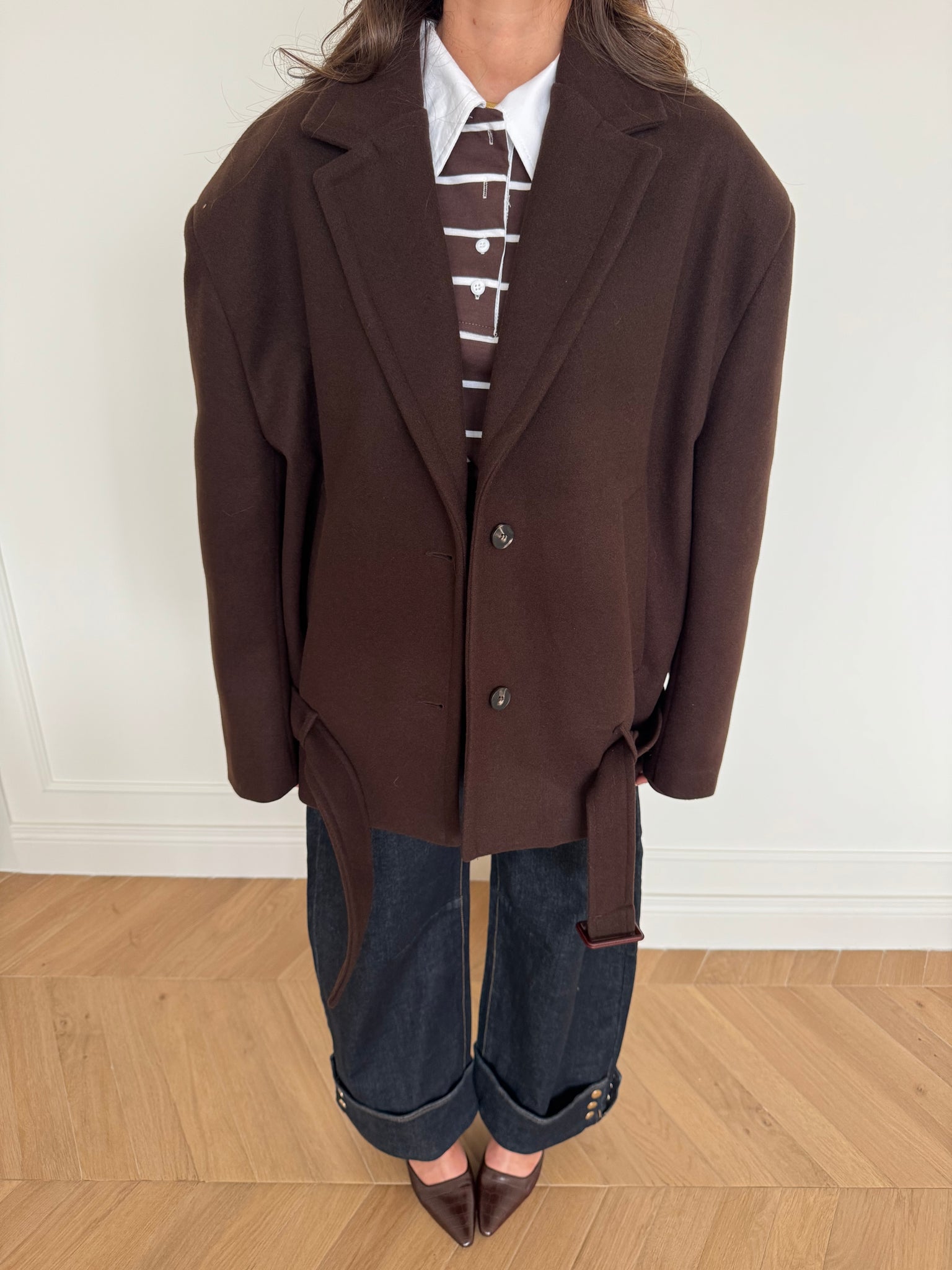 Cappotto corto con collo a revers. Chiusura frontale con bottoni. Presenti tasche anteriori. Dettaglio cintura in vita. Vestibilità regolare, disponibile in taglia UNICA.