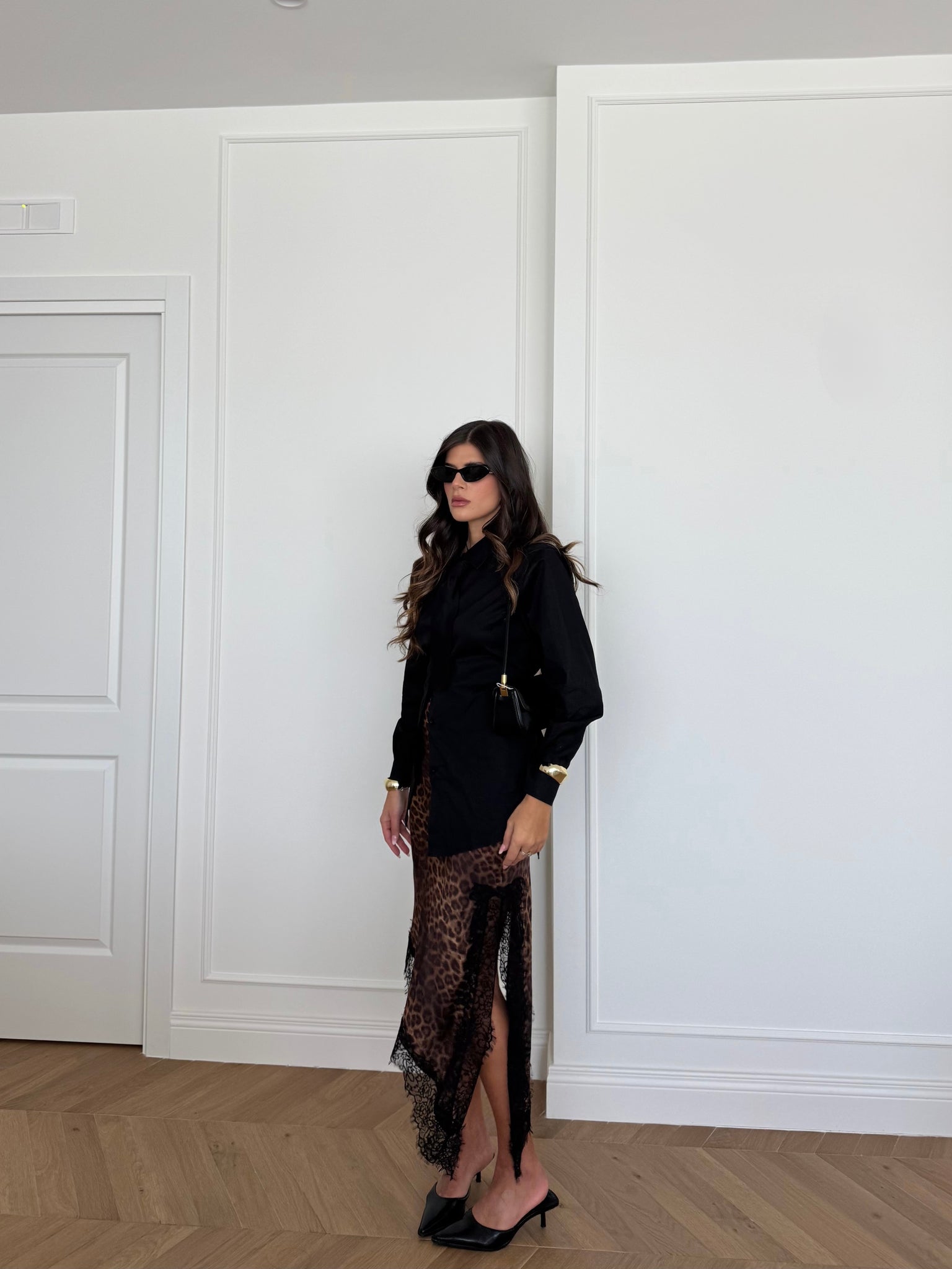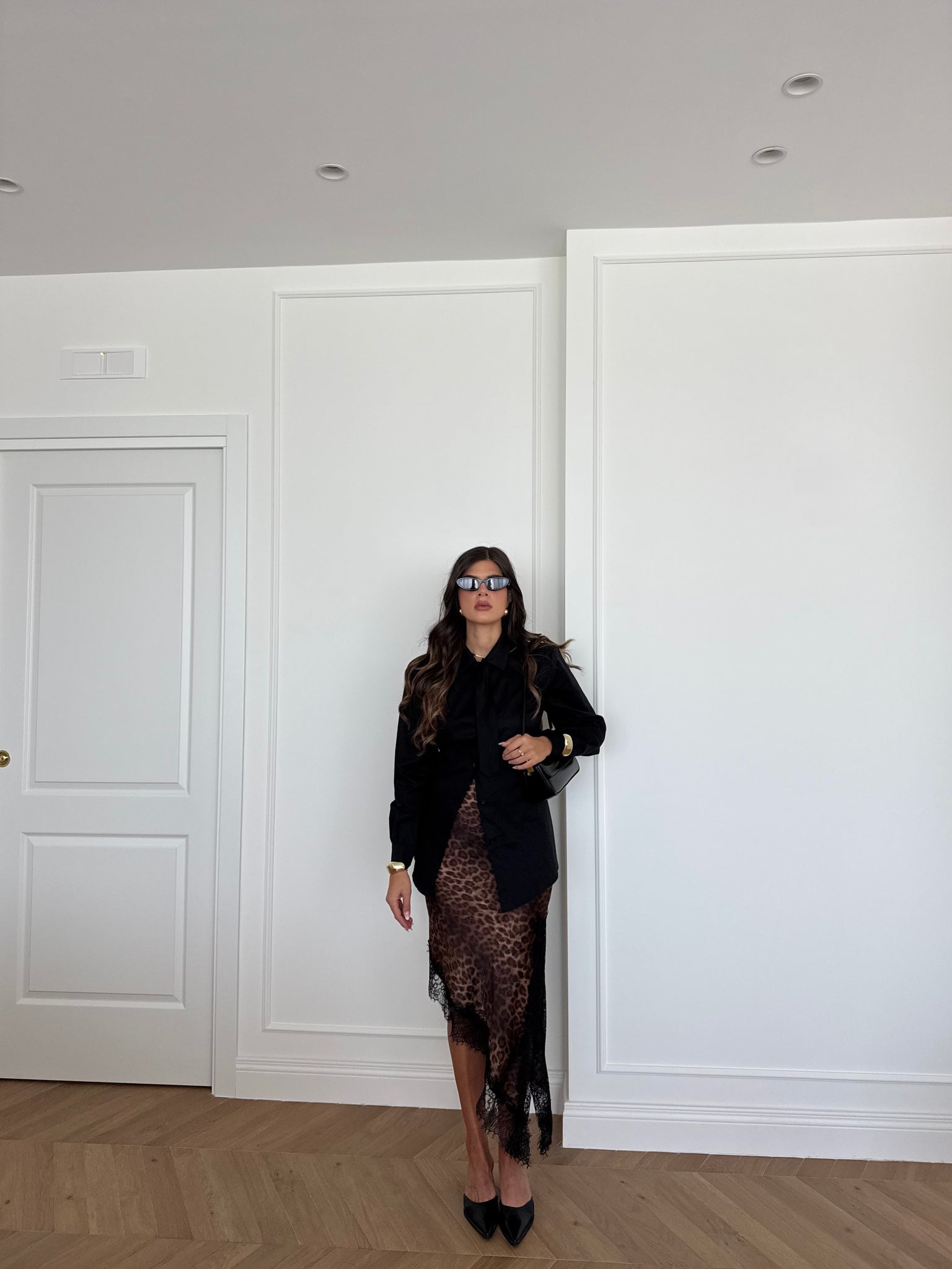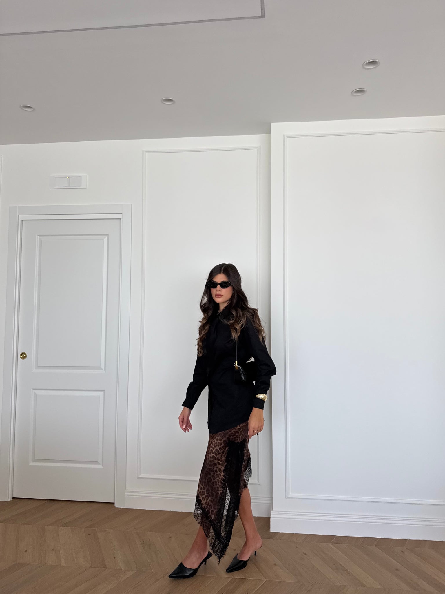 Gonna asimmetrica in viscosa con stampa.Presenta spacco e pizzo. Vita elasticizzata.Vestibilità morbida.