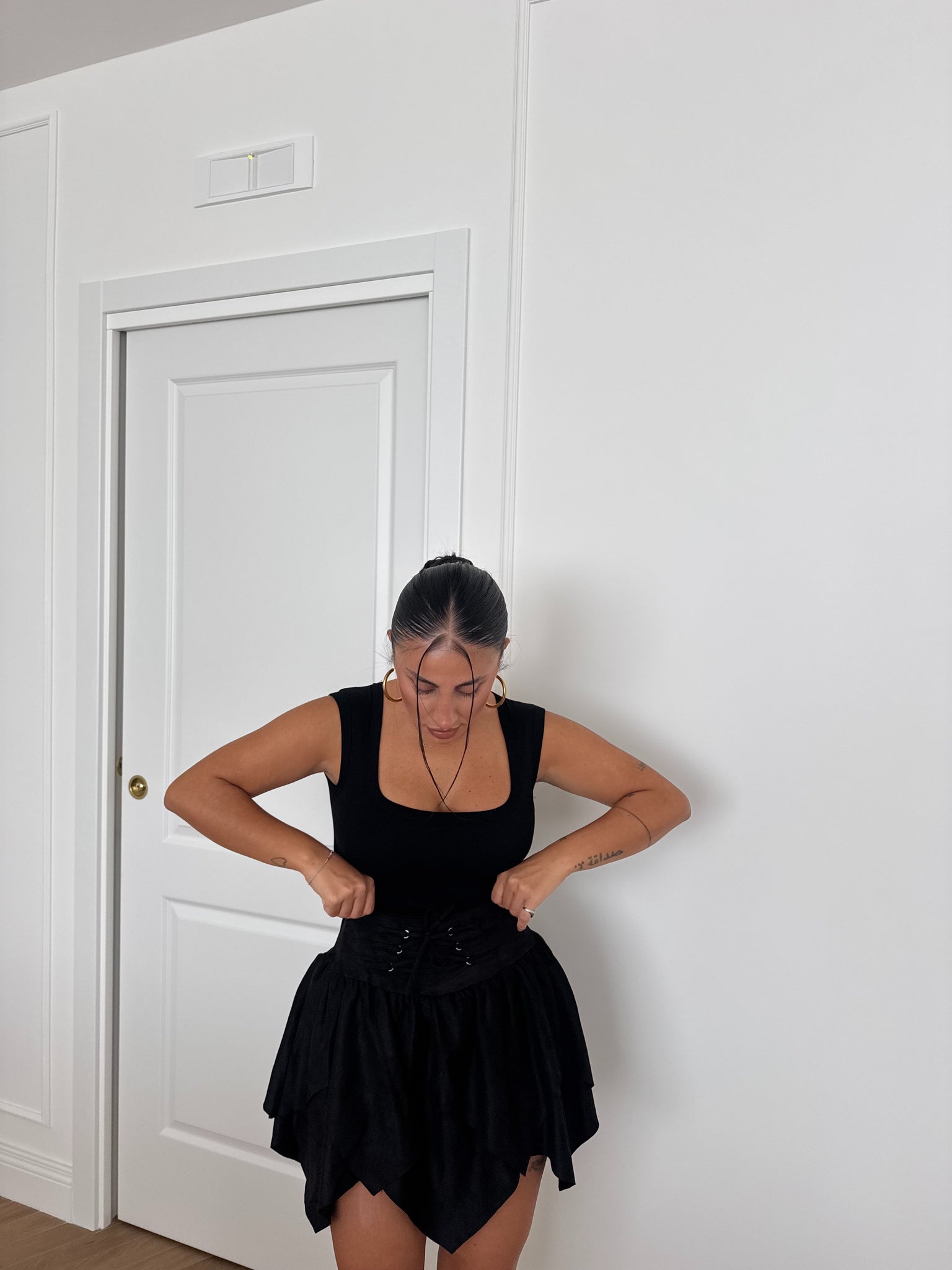 Gonna con fodera a pantaloncino con orlo elastico. Martina è alta 1,57cm indossa tg S.