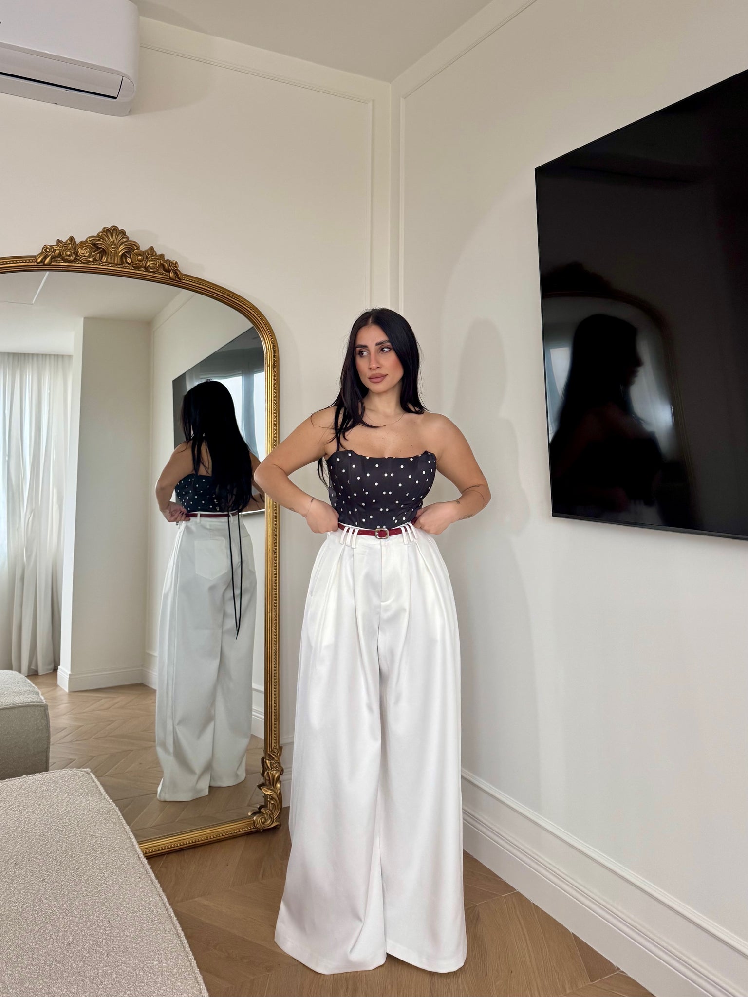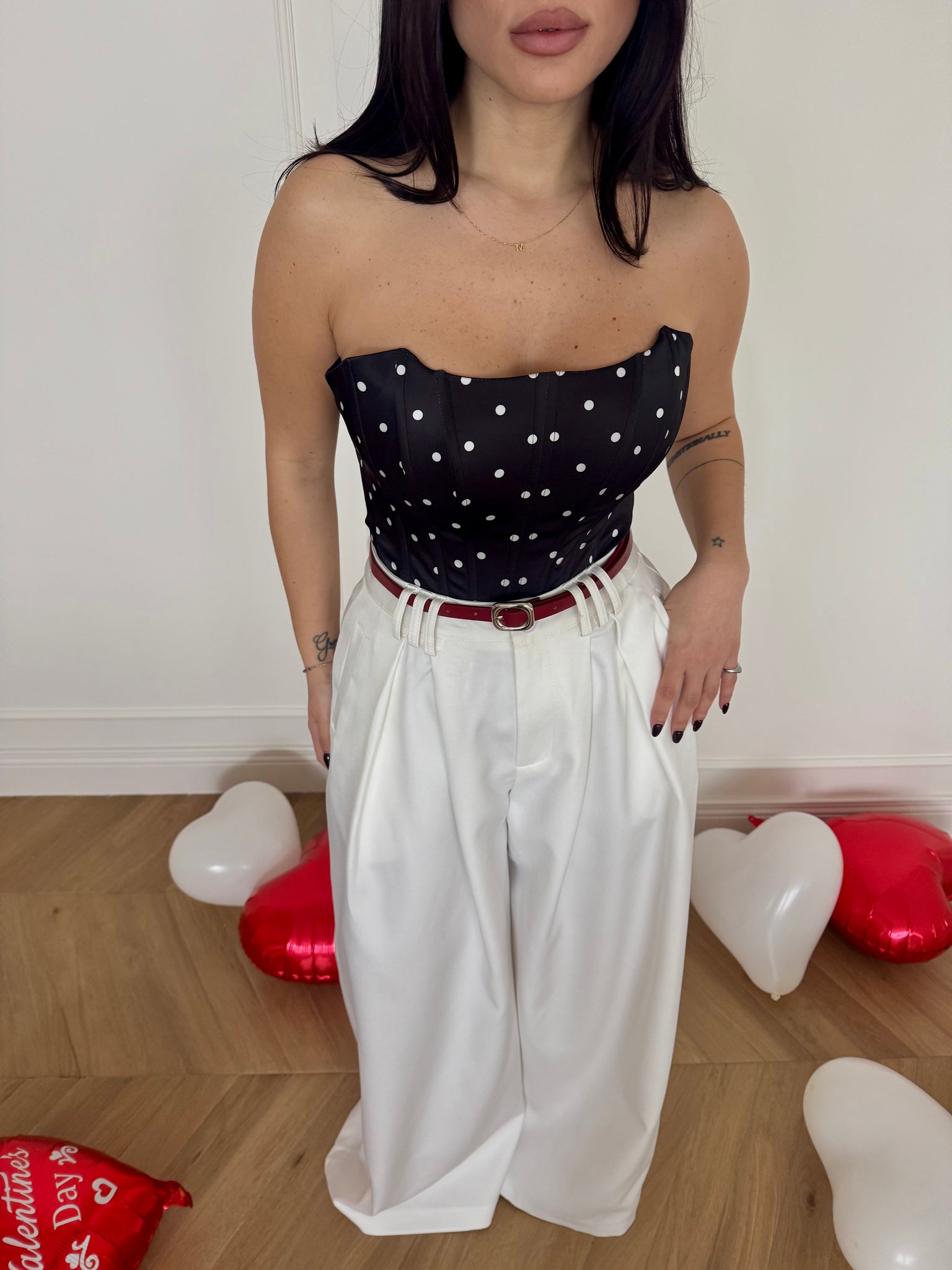 corsetto con spalle scoperte. Dettaglio di stecche. Orlo asimmetrico. Chiusura con lacci sulla schiena.