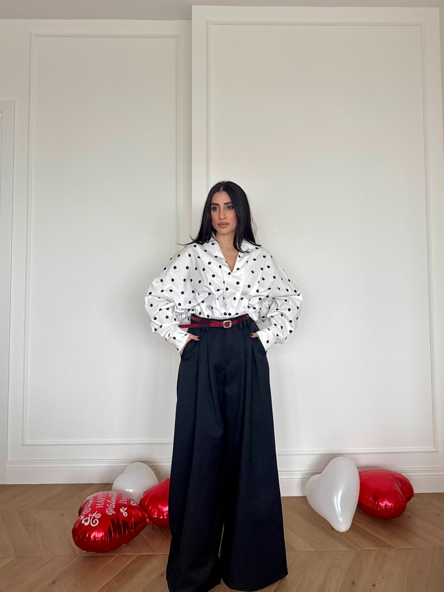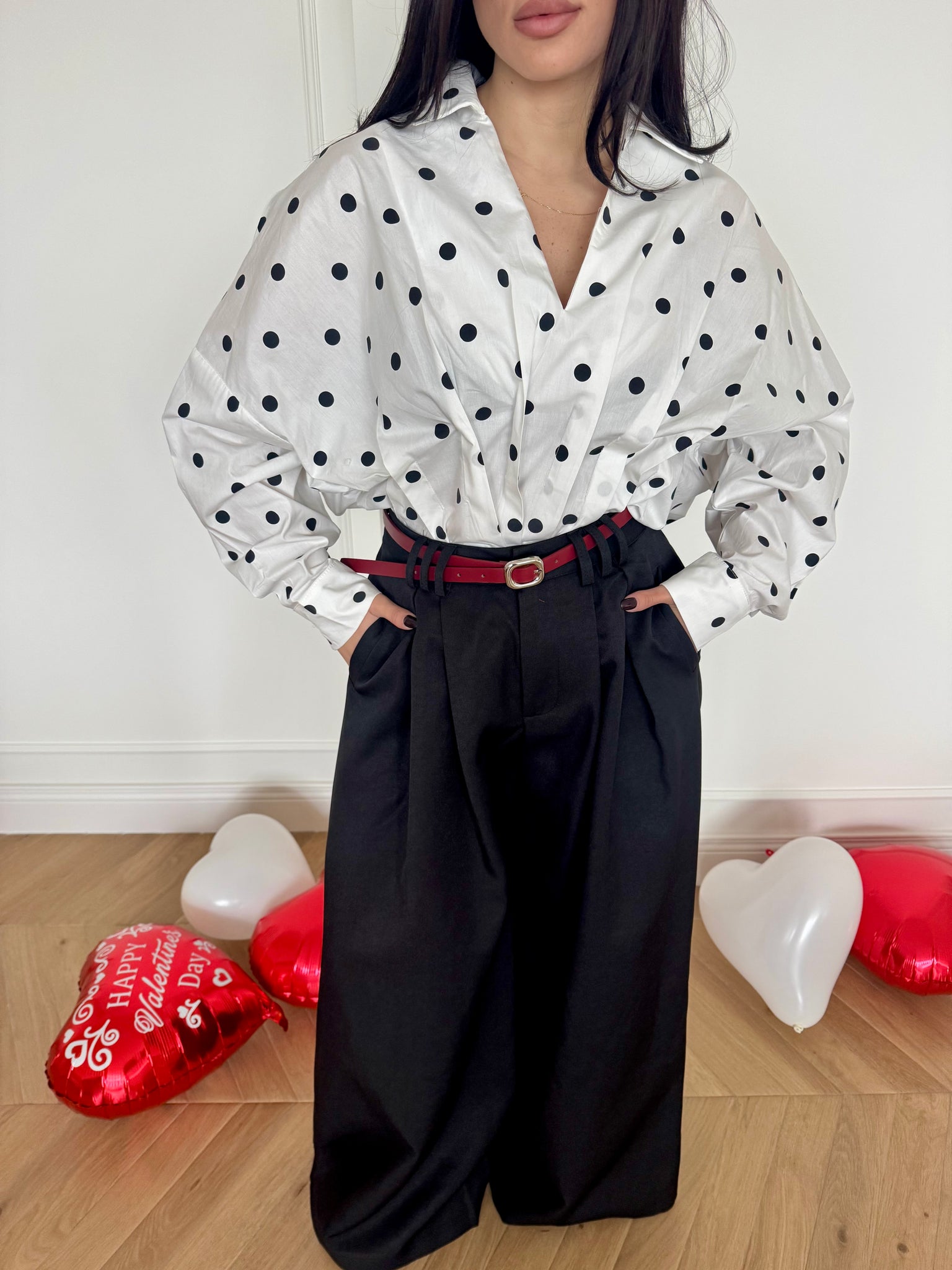 Pantaloni palazzo vita alta con pince e tasche anteriori, cintura bordeaux inclusa.