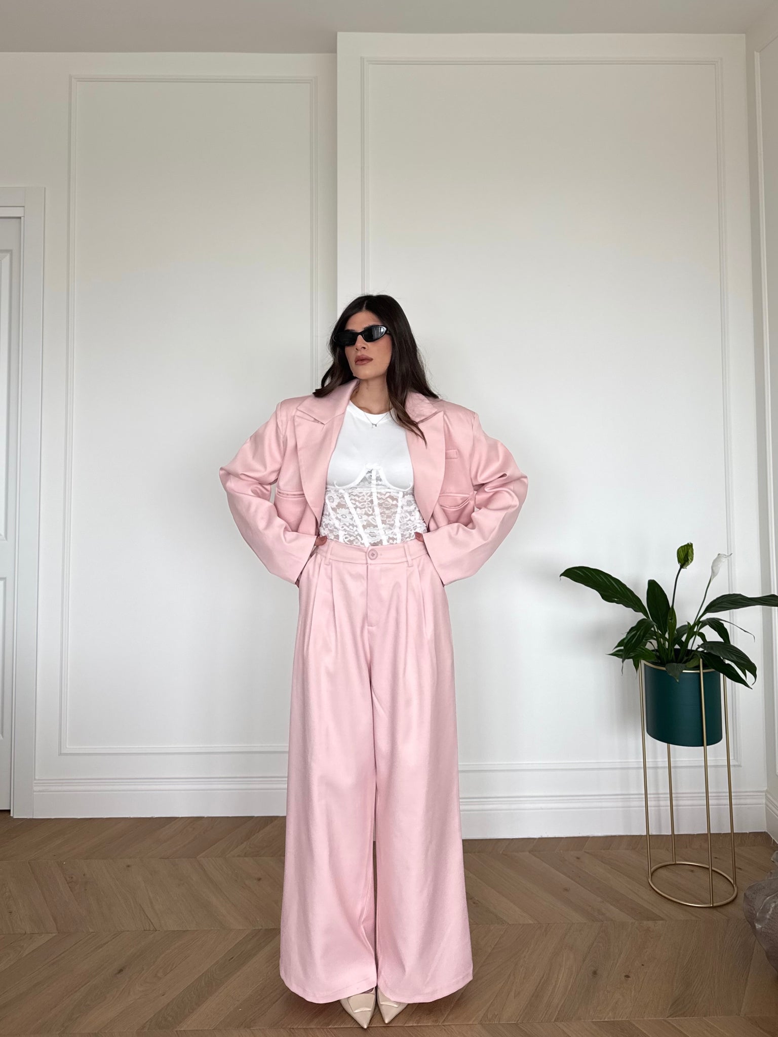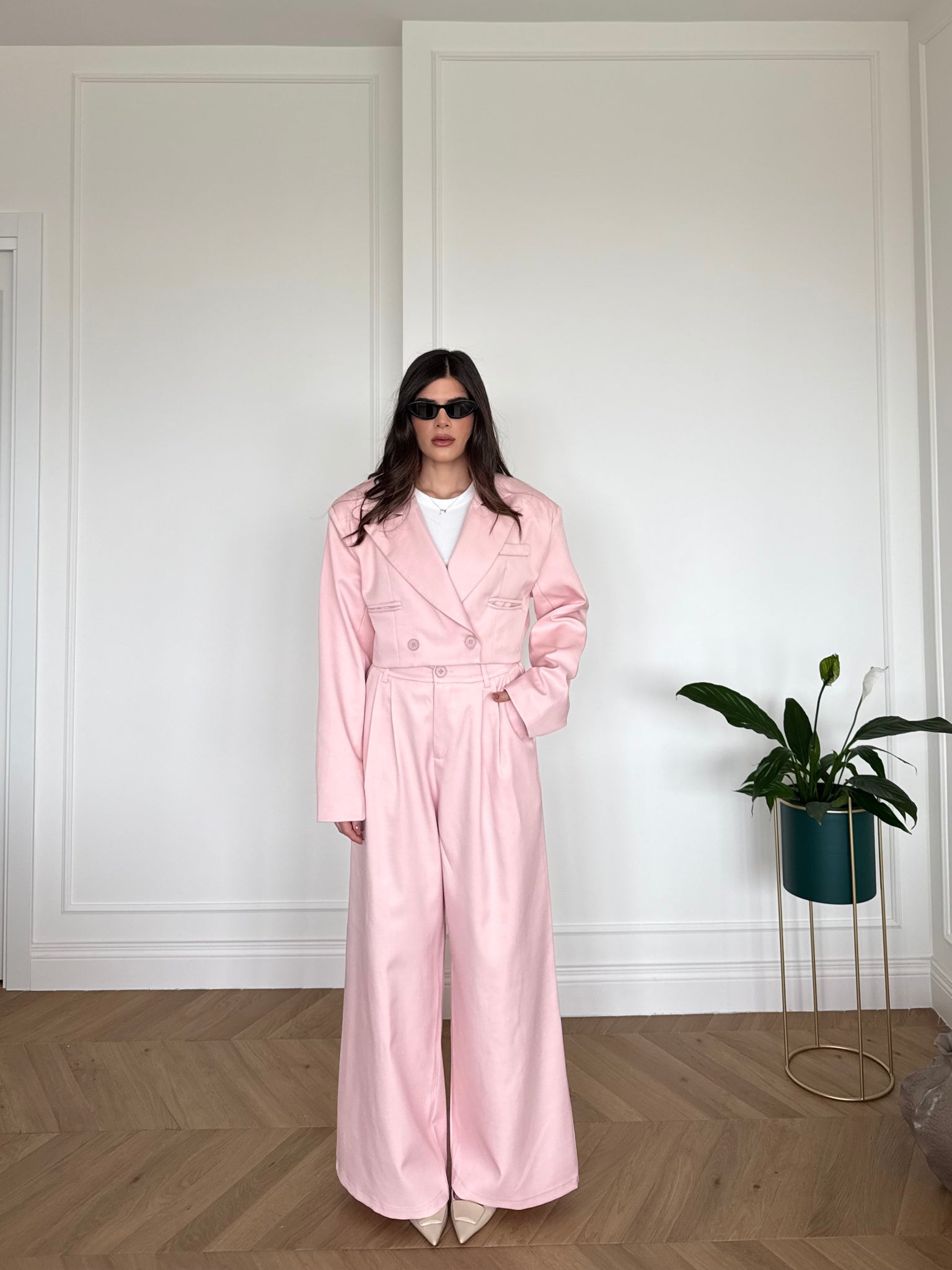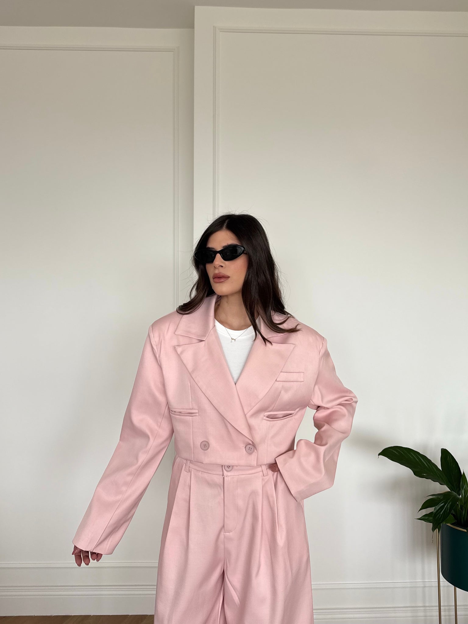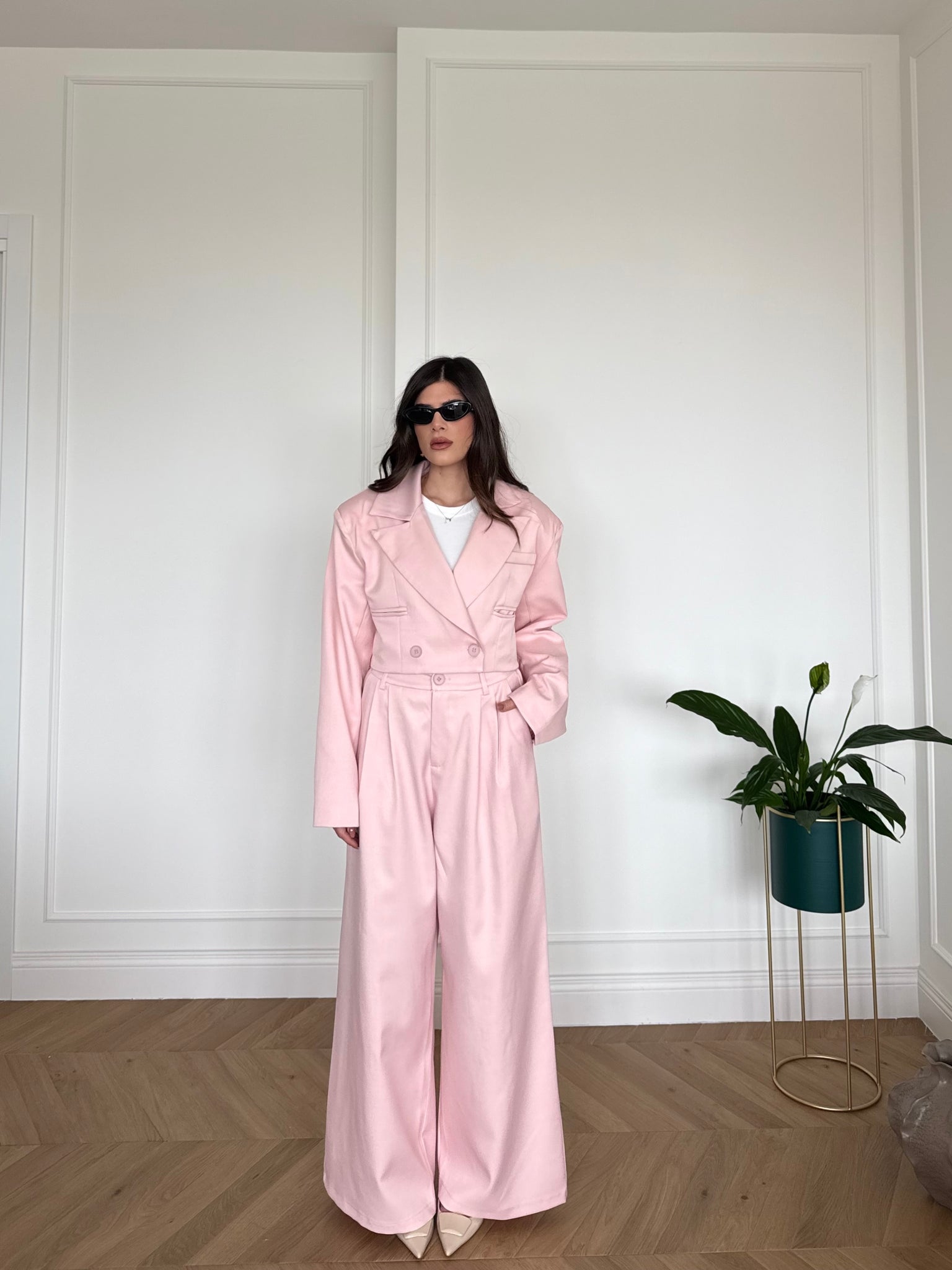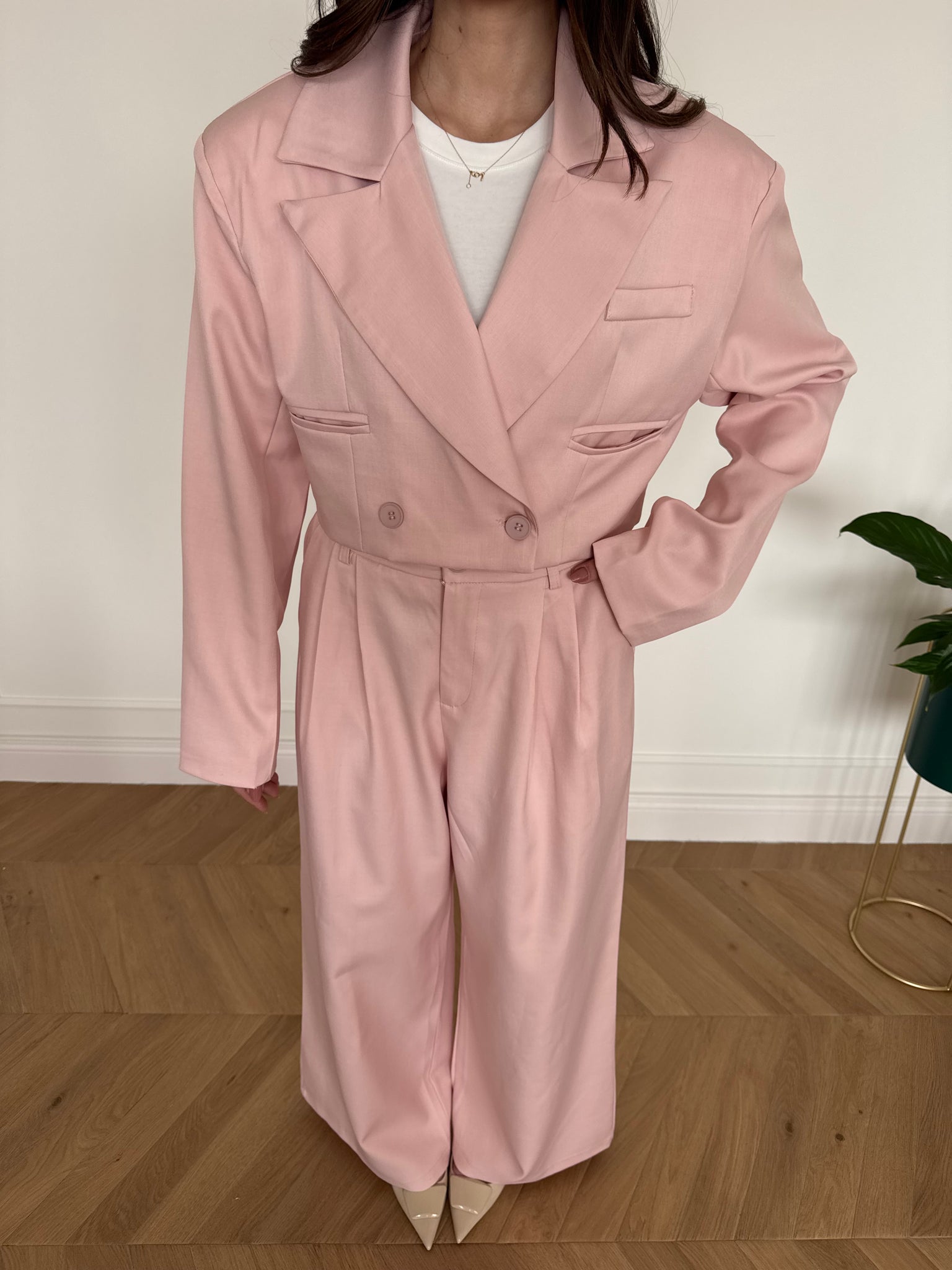Set composto da giacca crop e pantaloni con elastico sul retro. Francesca è alta 1,68cm indossa tg S/M