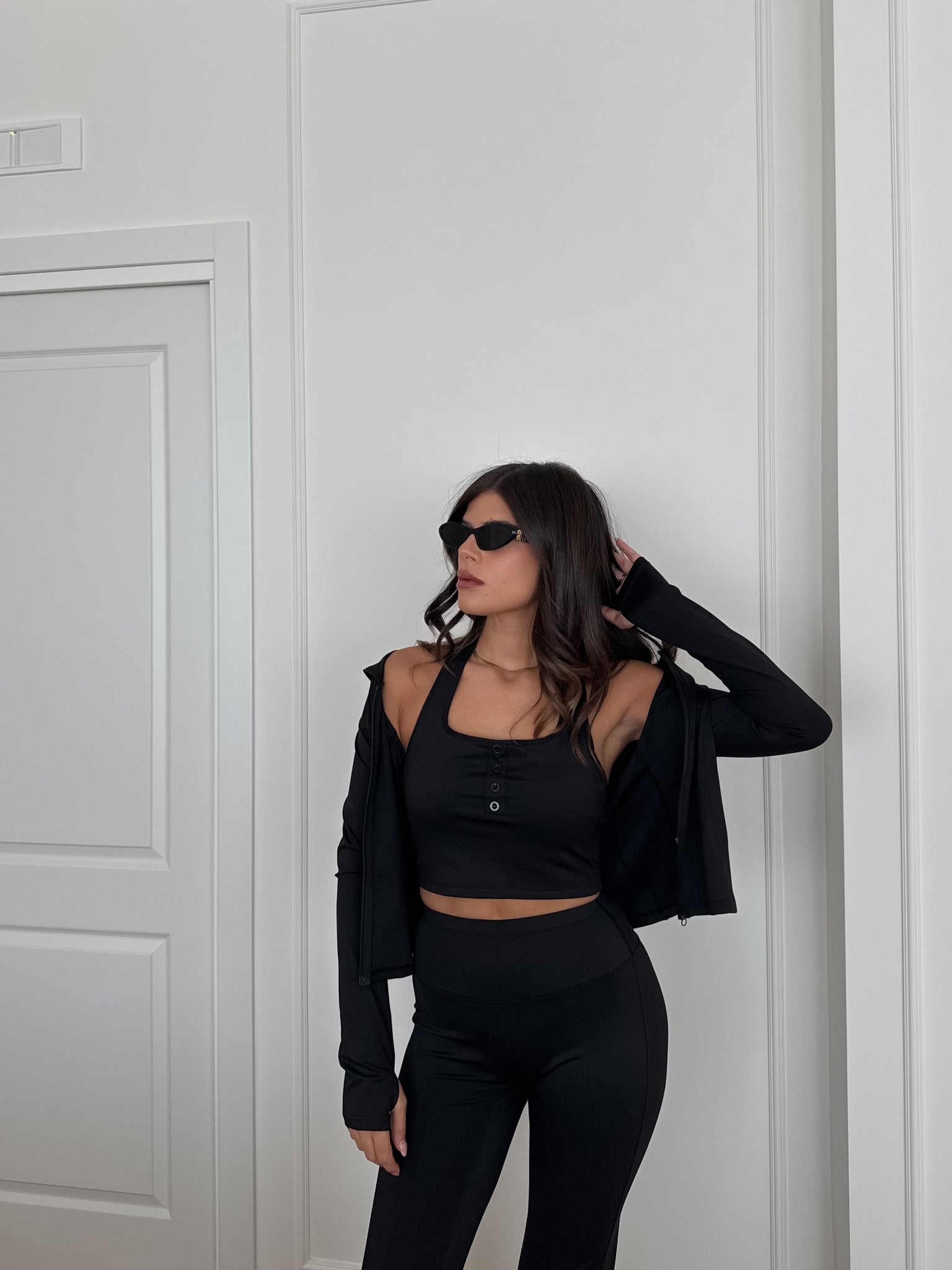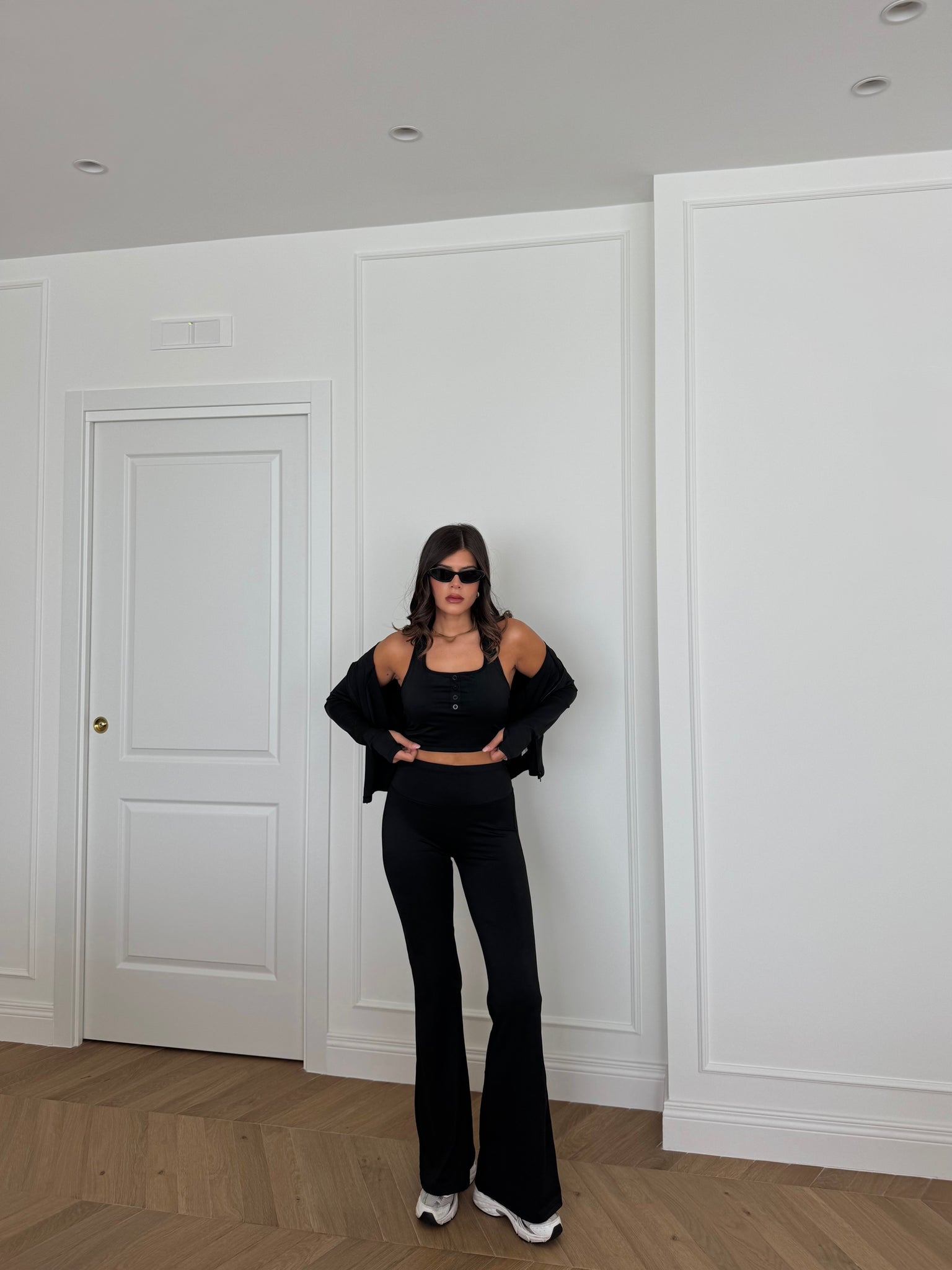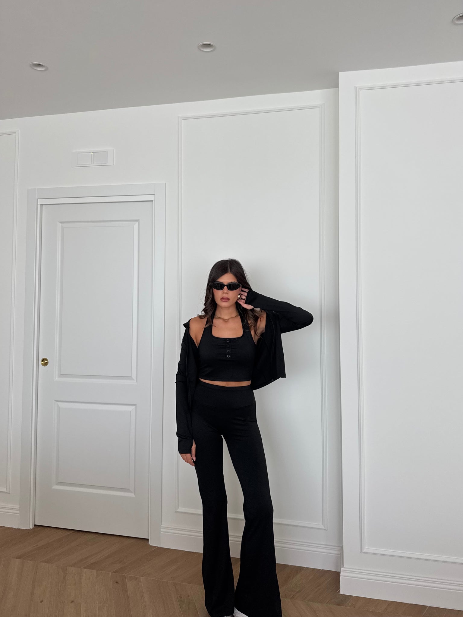 Coordinato composto da giacca con chiusura con zip, top con coppe imbottite e pantaloni a zampa. Francesca è alta 1,68cm indossa tg S/M.