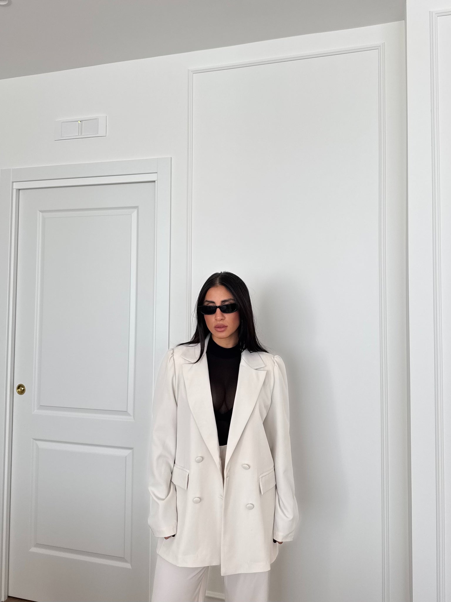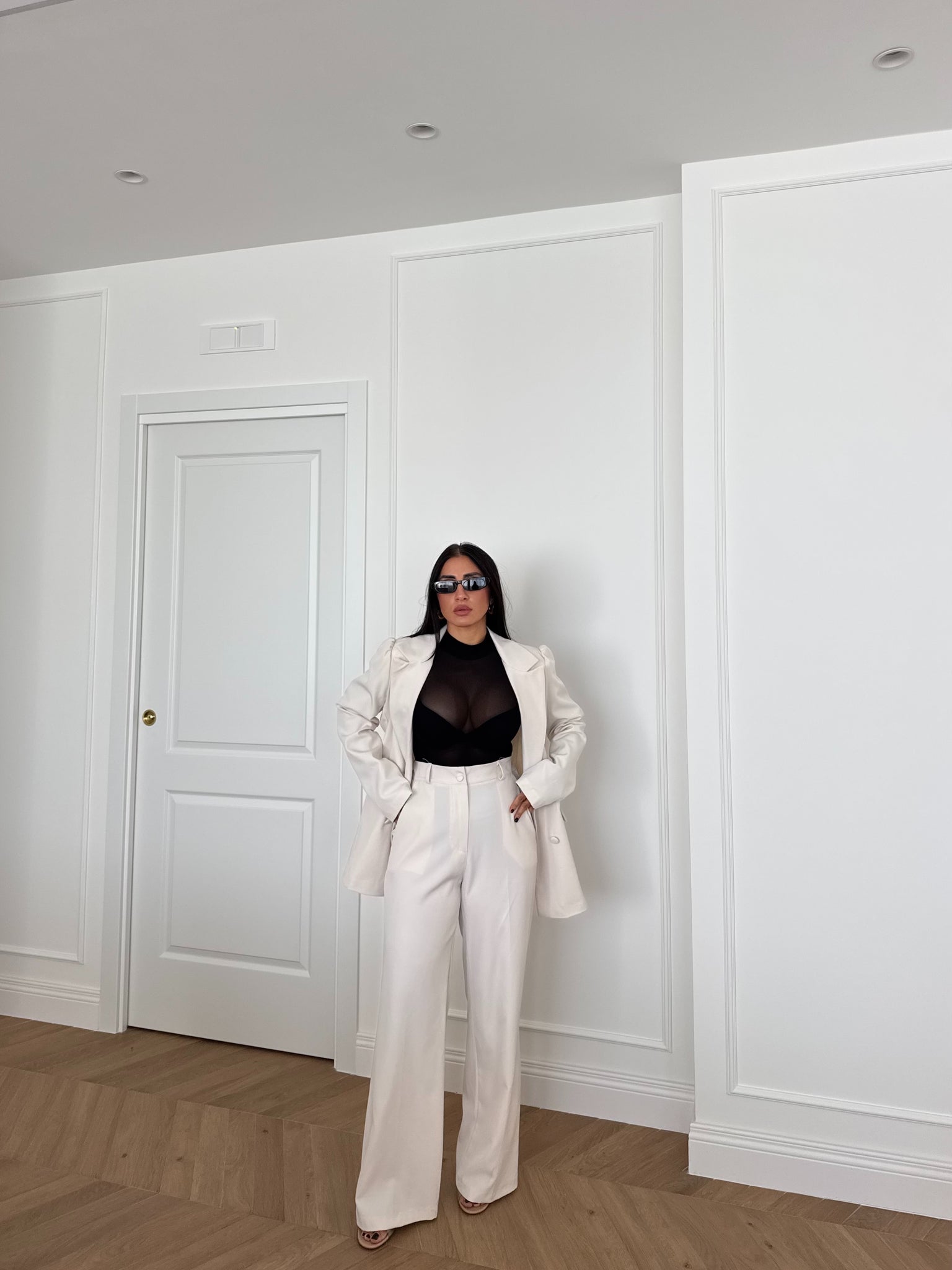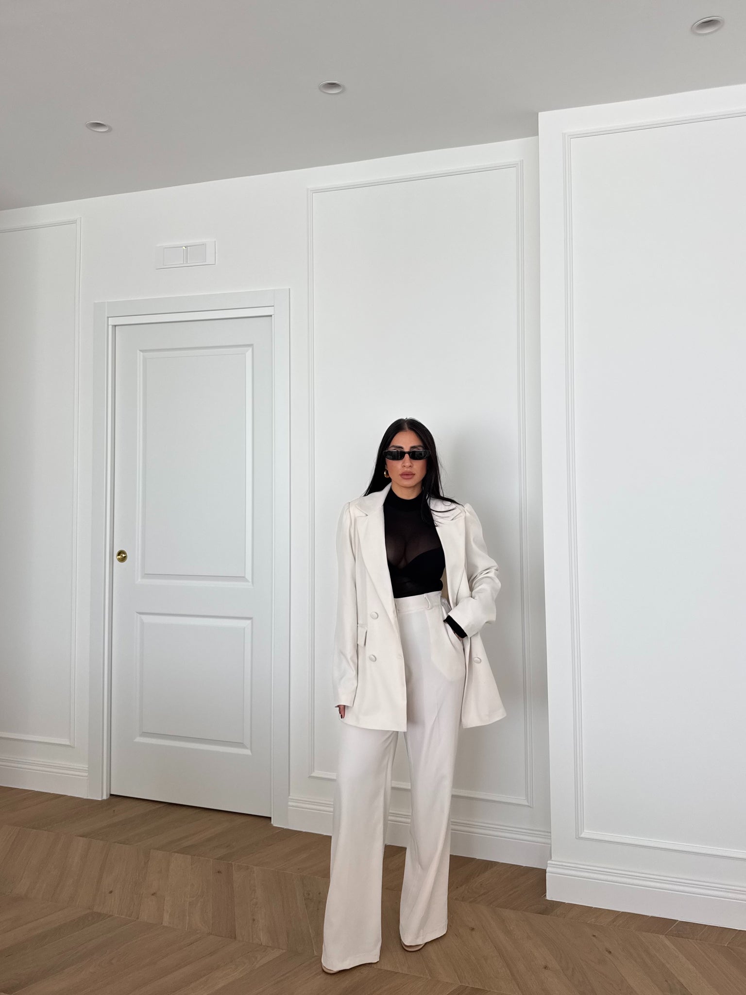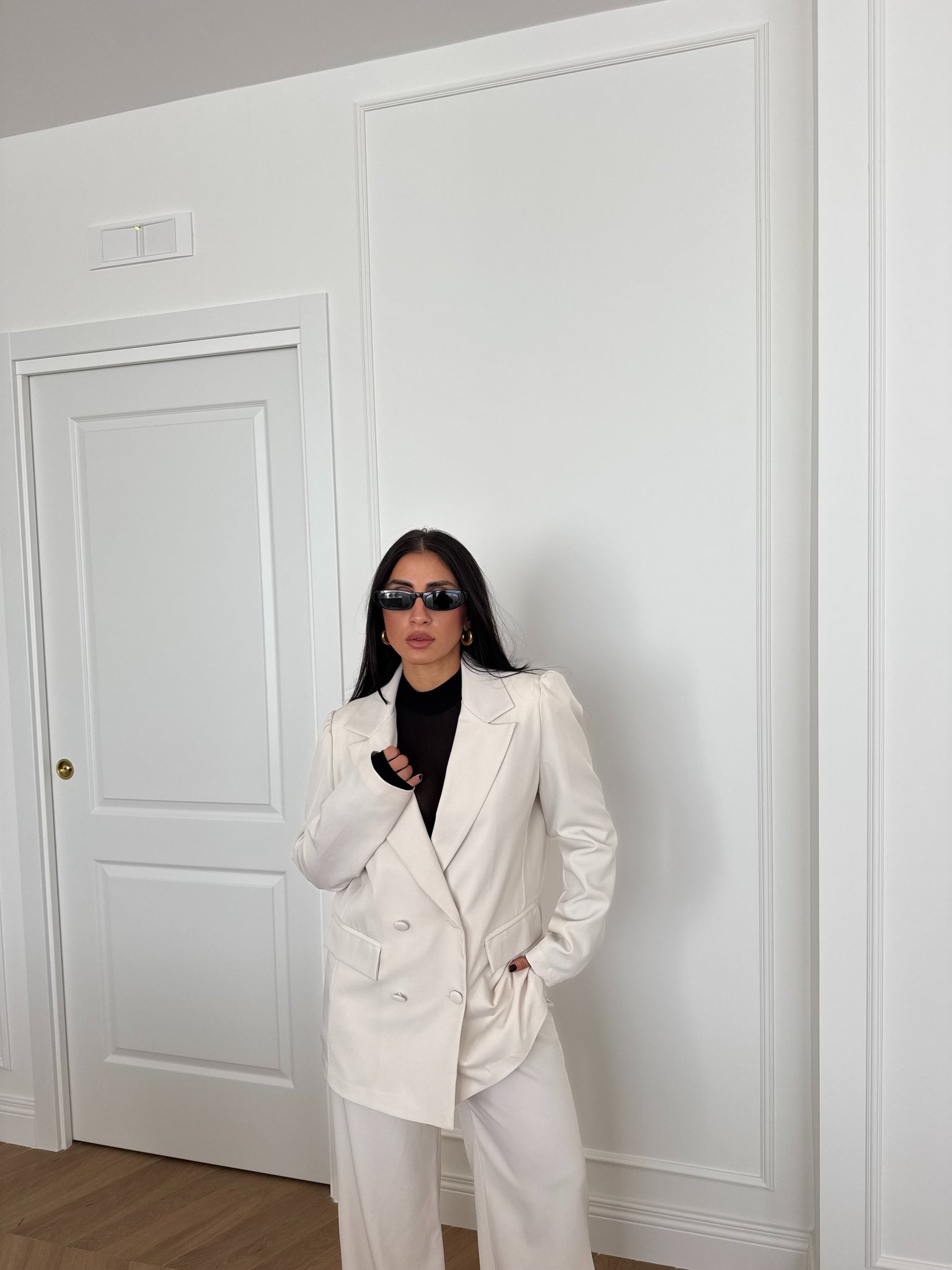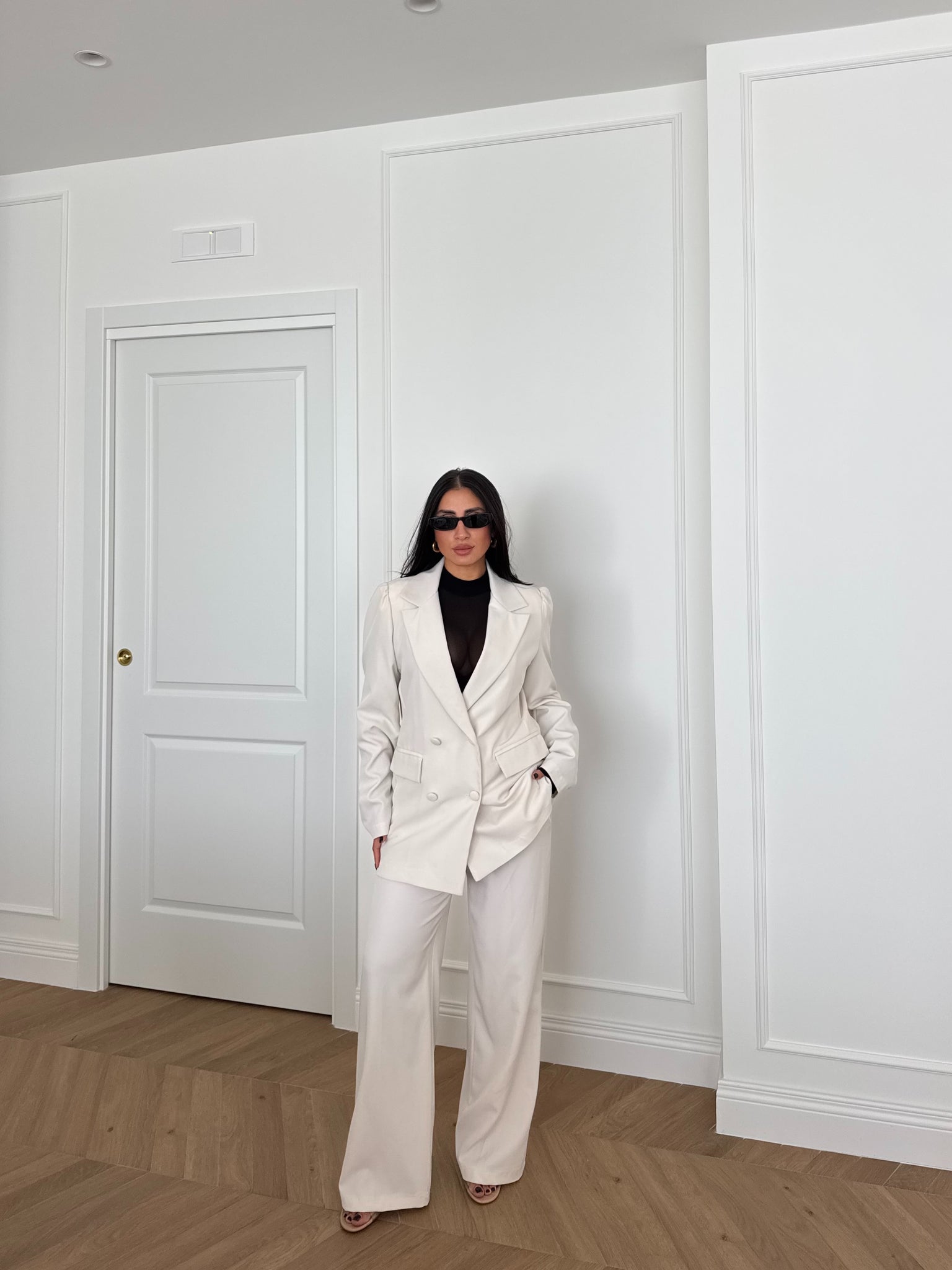 Tailleur taglia unica composto da giacca doppiopetto oversize e pantaloni gamba larga, chiusura con bottone e cerniera, elastico in vita sul retro.