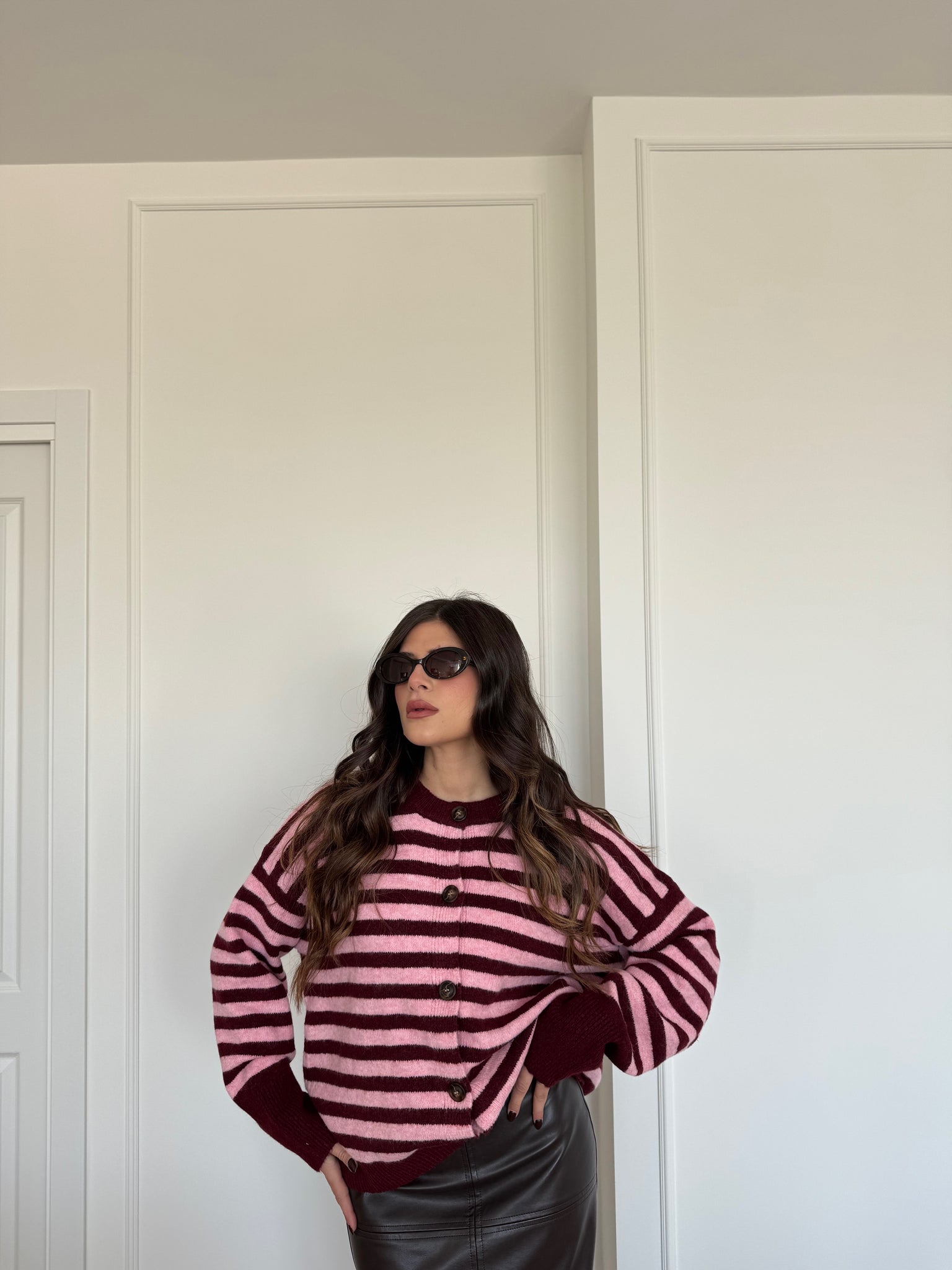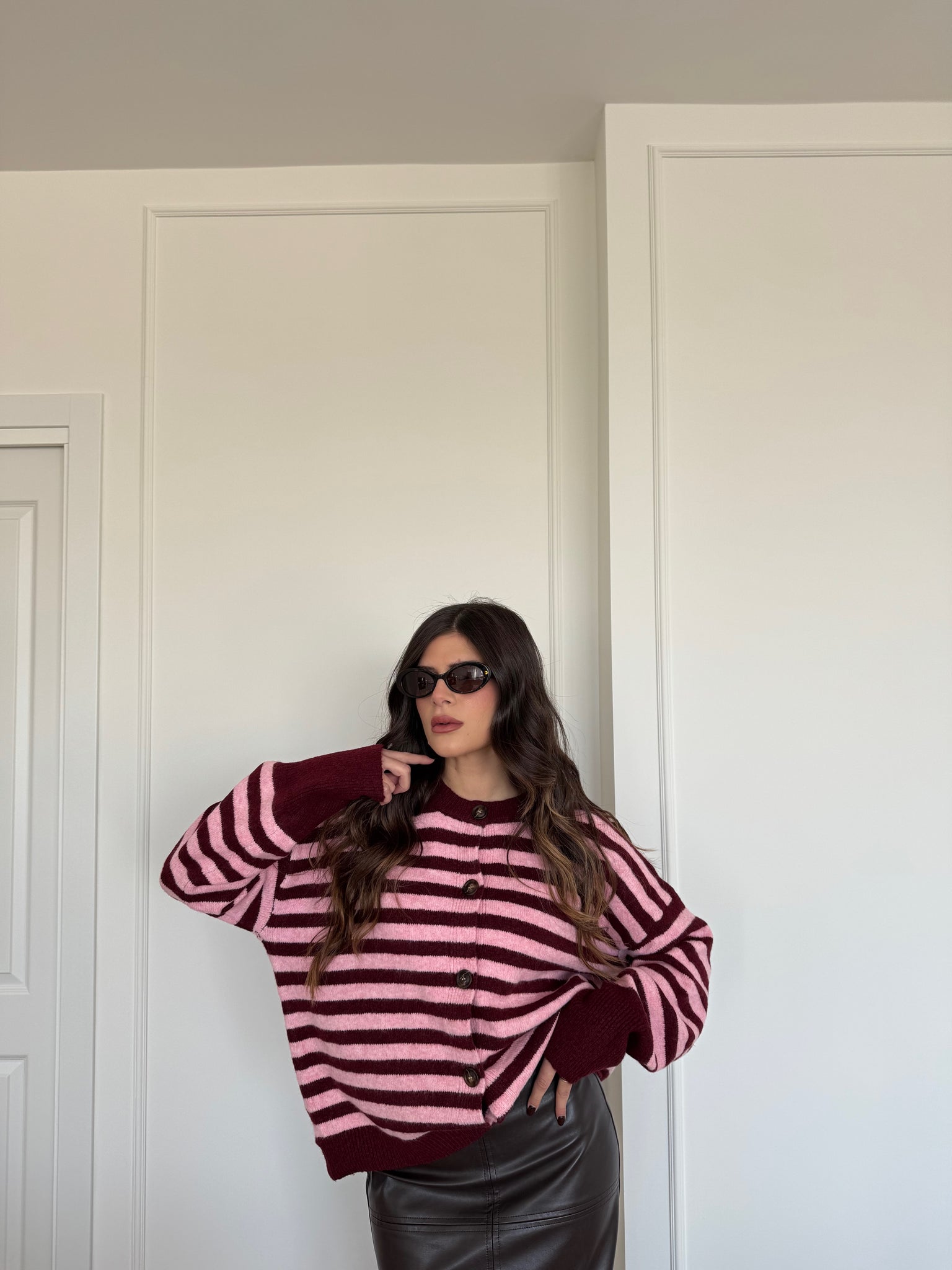 CARDIGAN RIGHE BORDEAUX/ROSA